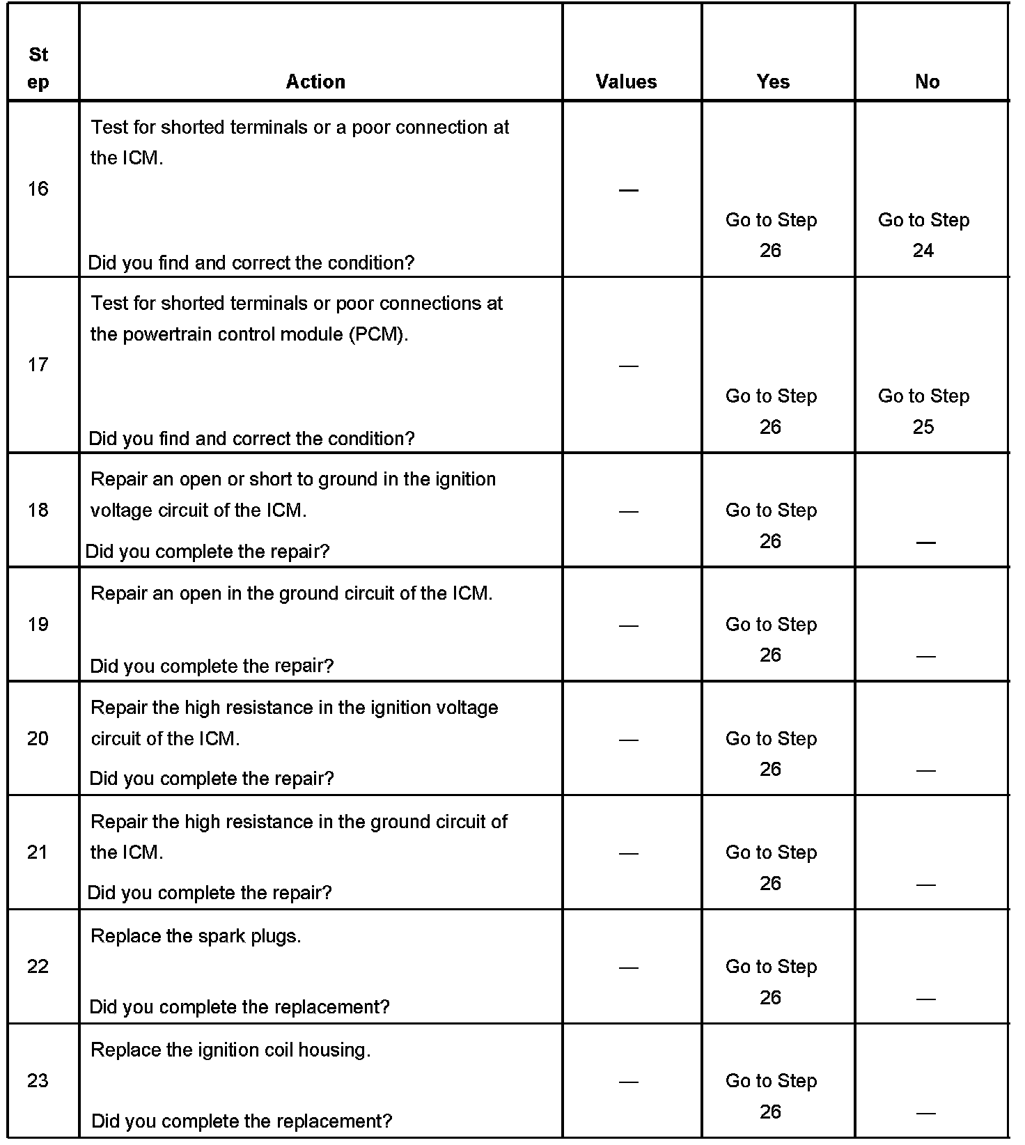 Each ignition coil supplies secondary voltage to a pair of spark plugs. This is called a waste spark ignition system. The powertrain control module (PCM) supplies a signal on each of the ignition control (IC) timing circuits to the ignition control module (ICM). The ICM fires the correct ignition coil at the correct time based on the signals. The ICM detects if cylinder 1 or cylinder 3 is on the compression stroke by sensing the secondary voltage and polarity of each side of the ignition coil. The ICM detects this voltage with sensing circuitry integrated into each ignition coil. The higher voltage is on the compressing cylinder.