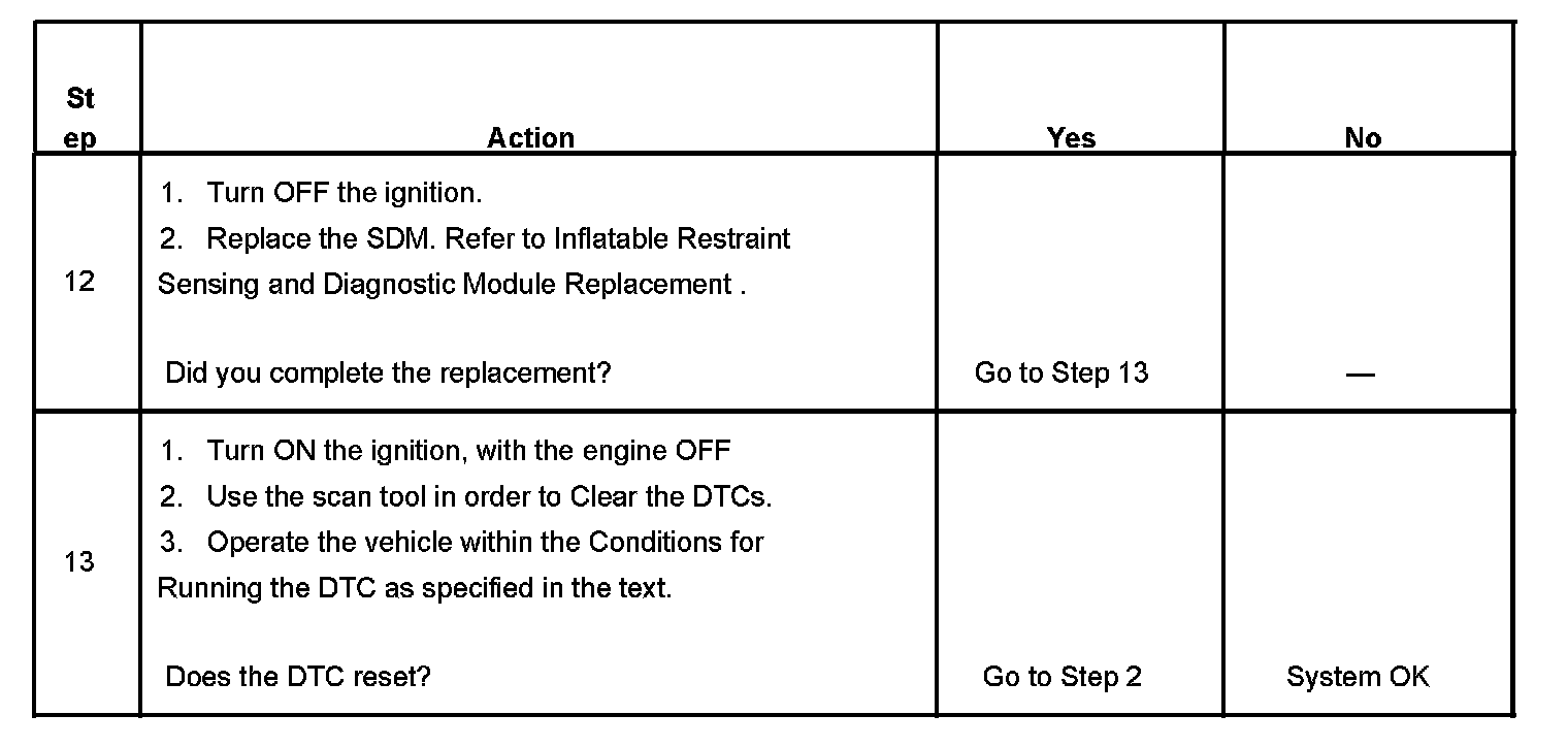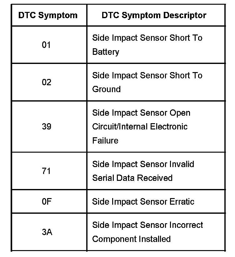 The inflatable restraint side impact sensor (SIS) utilizes a unidirectional 2-wire circuit. The SIS modulates current on the interface to send ID, State of Health, and deployment commands to the inflatable restraint sensing and diagnostic module (SDM). The SDM serves as a power source and a ground for the SIS. When the ignition is turned on and input power from the SDM is first detected, the SIS responds by performing internal diagnostics and sending an ID to the SDM. The SDM considers the ID to be valid if the response time is less than 5 seconds. The SIS continually communicates status messages to the SDM, which determines if a fault is present in the SIS circuit. When a fault is detected, the SDM resets the SIS twice by removing and reapplying power to it. If the fault is still present, the SDM will set a diagnostic trouble code (DTC).