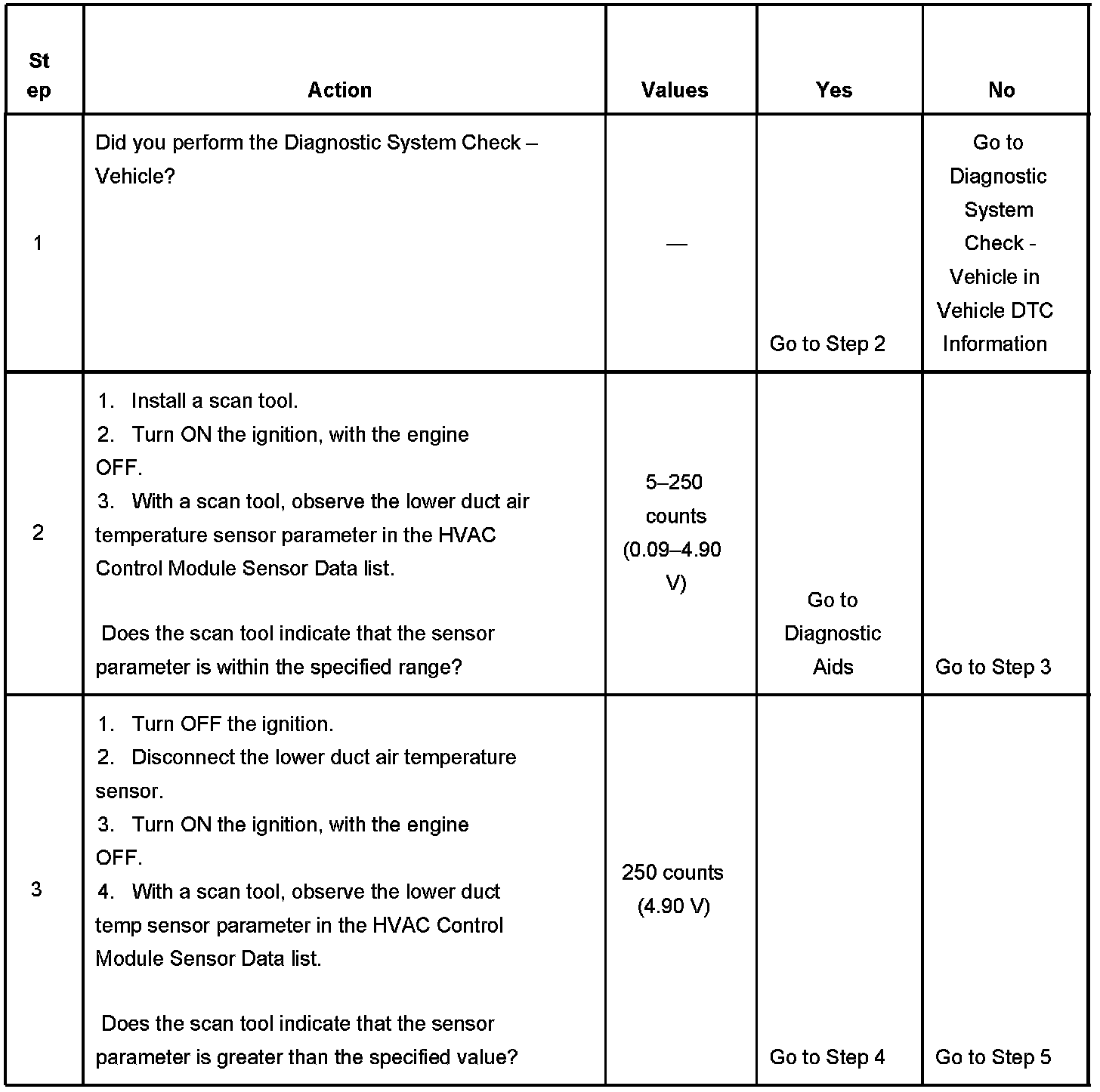 The HVAC control module detects the signal circuit is less than 5 counts (0.09V) or greater than 250 counts (4.90 V).