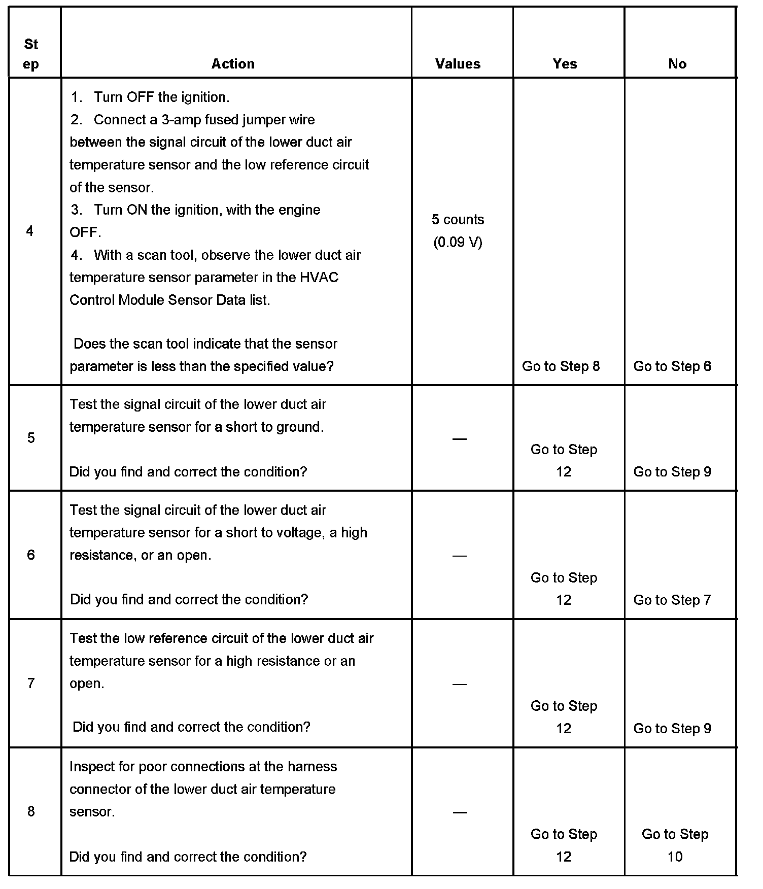 The HVAC control module monitors the signal circuit of the lower air temperature sensor for the following conditions: