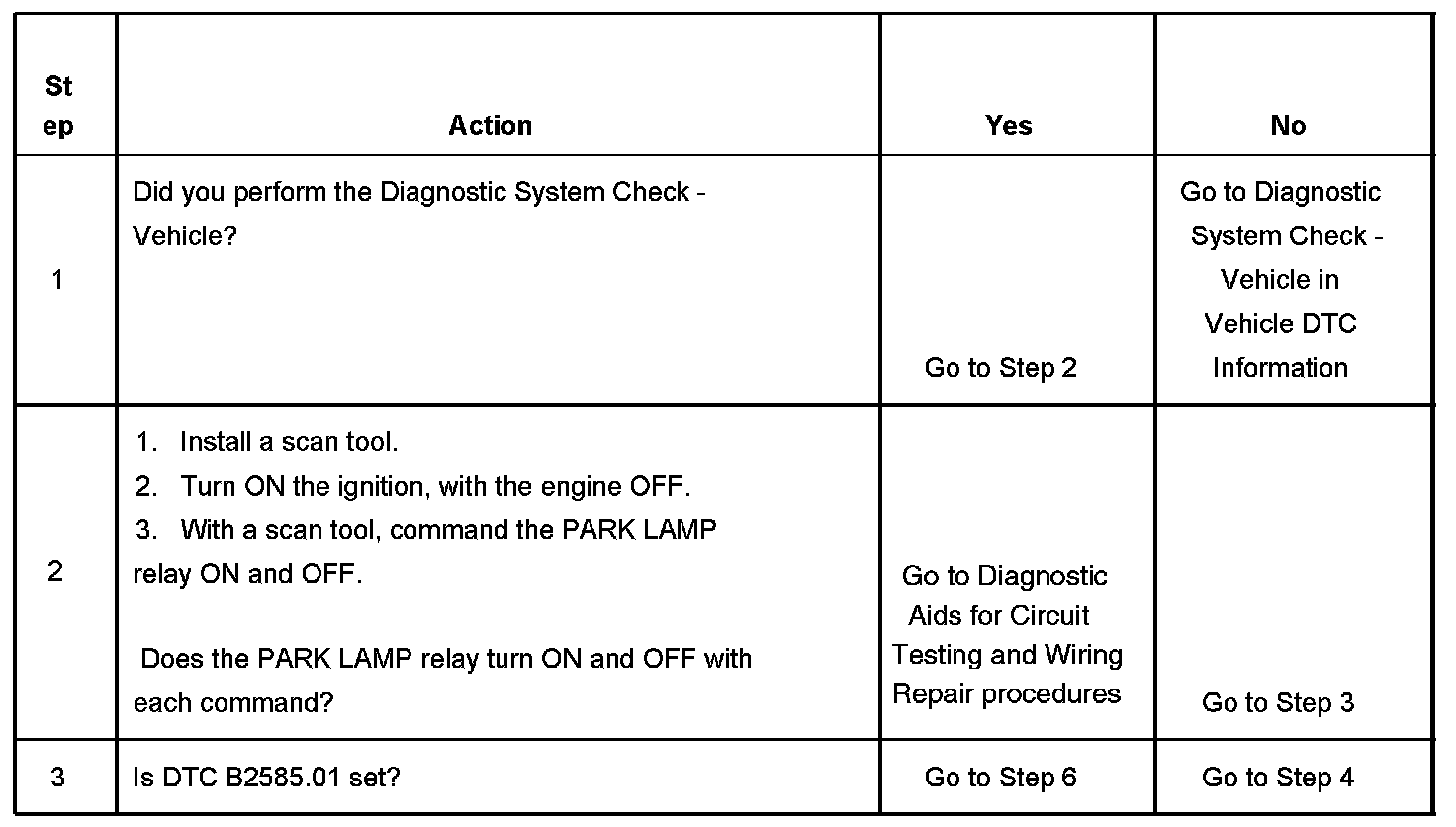 - B2585-06 will set if there is an open or short to ground in the park lamp relay control circuit.