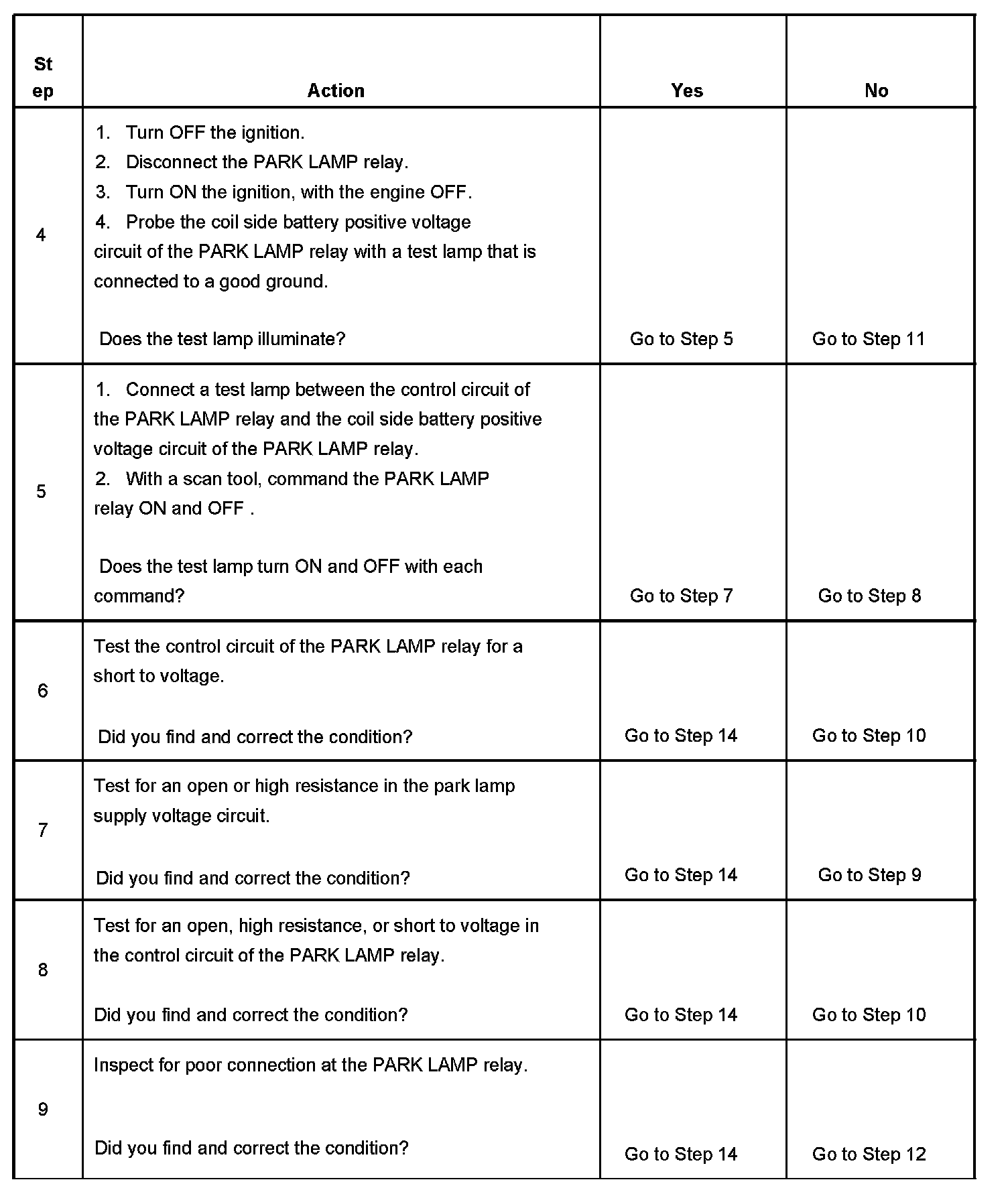 4. Tests for voltage at the coil side of the PARK LAMP relay.