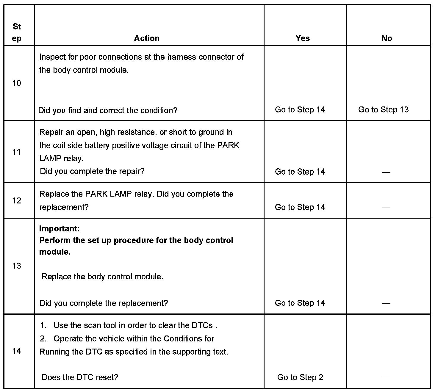5. Verifies that the body control module is providing ground to the PARK LAMP relay.