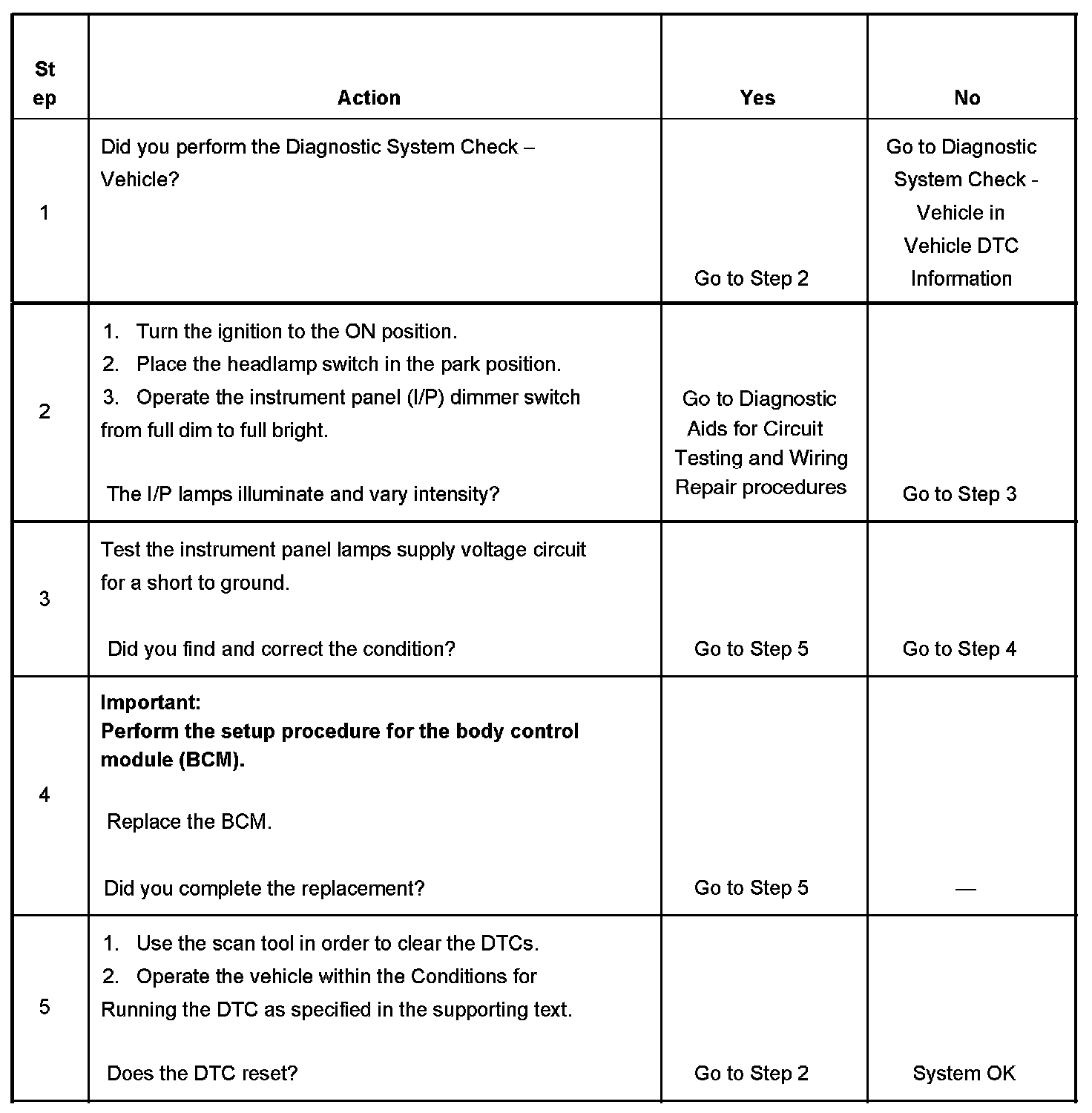 - The BCM detects a short to ground in the instrument panel lamp supply voltage circuit.