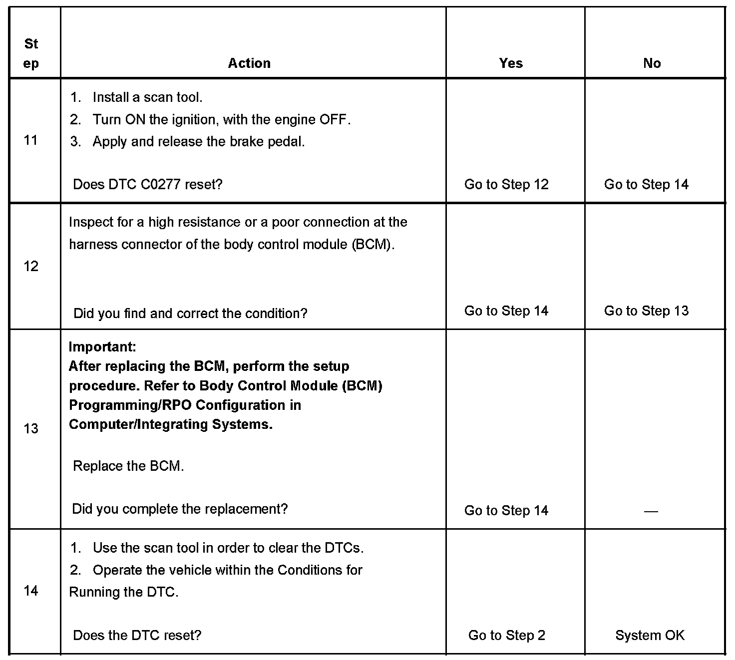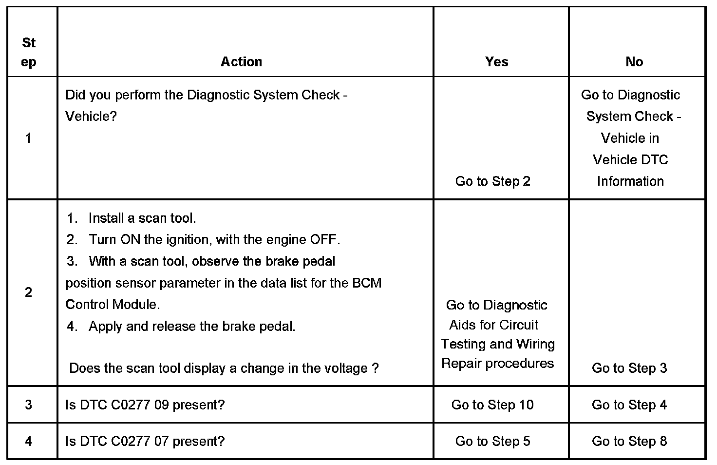- If DTC C0277 09 is set, replace the brake pedal position sensor. If the DTC resets replace the BCM.