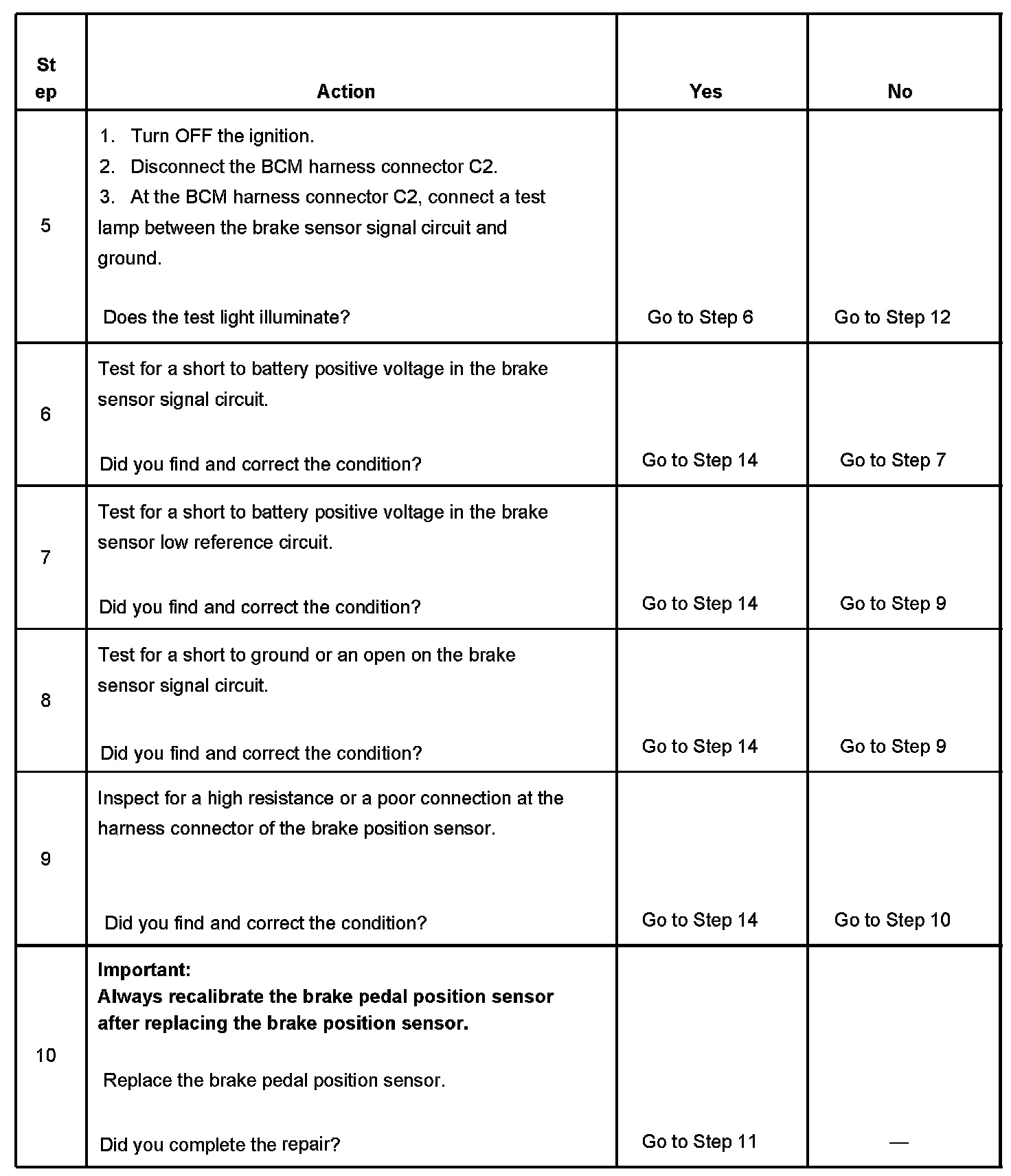 The body control module (BCM) applies a ground through the brake sensor reference low circuit to the brake pedal position sensor. The BCM supplies a 5-volt reference through the brake sensor reference voltage circuit to the brake pedal position sensor. When the brake pedal is being applied, the brake pedal position sensor then sends a variable voltage signal through the brake sensor signal circuit to the BCM.