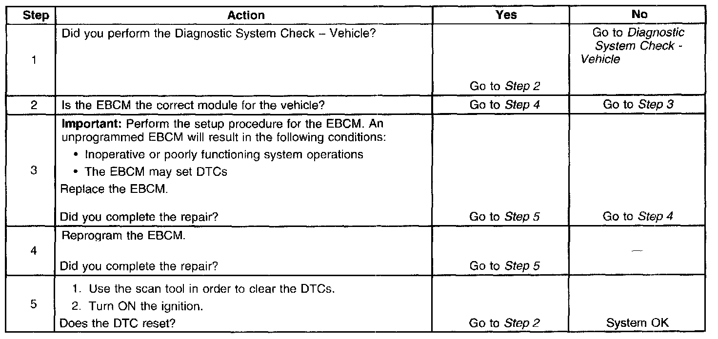 If the DTC was set after EBCM replacement, verify that the replacement EBCM and software are correct for the vehicle.