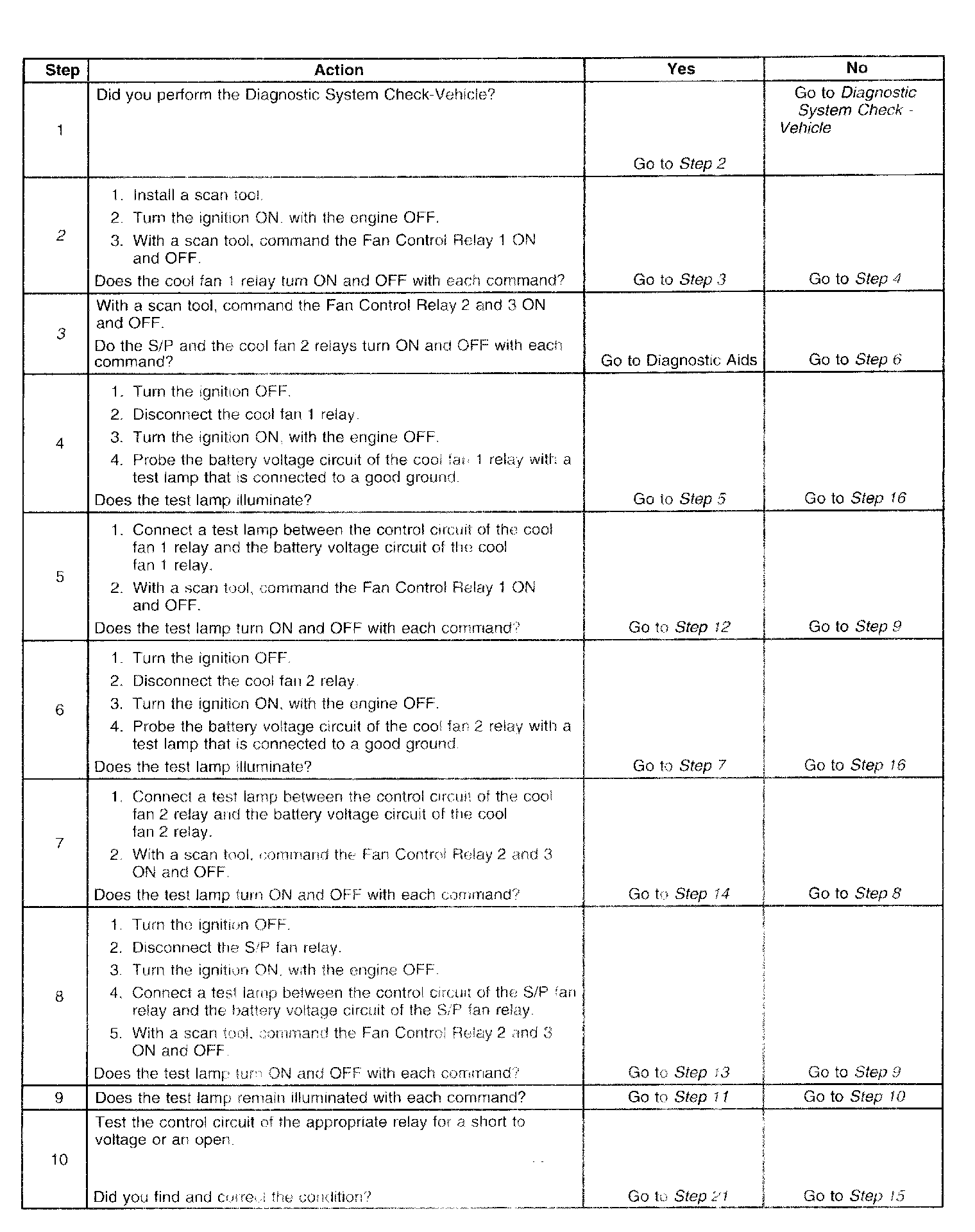 3. Listen for an audible click when the S/P and cool fan 2 relays operate. Command both the ON and OFF states. Repeat the commands as necessary.