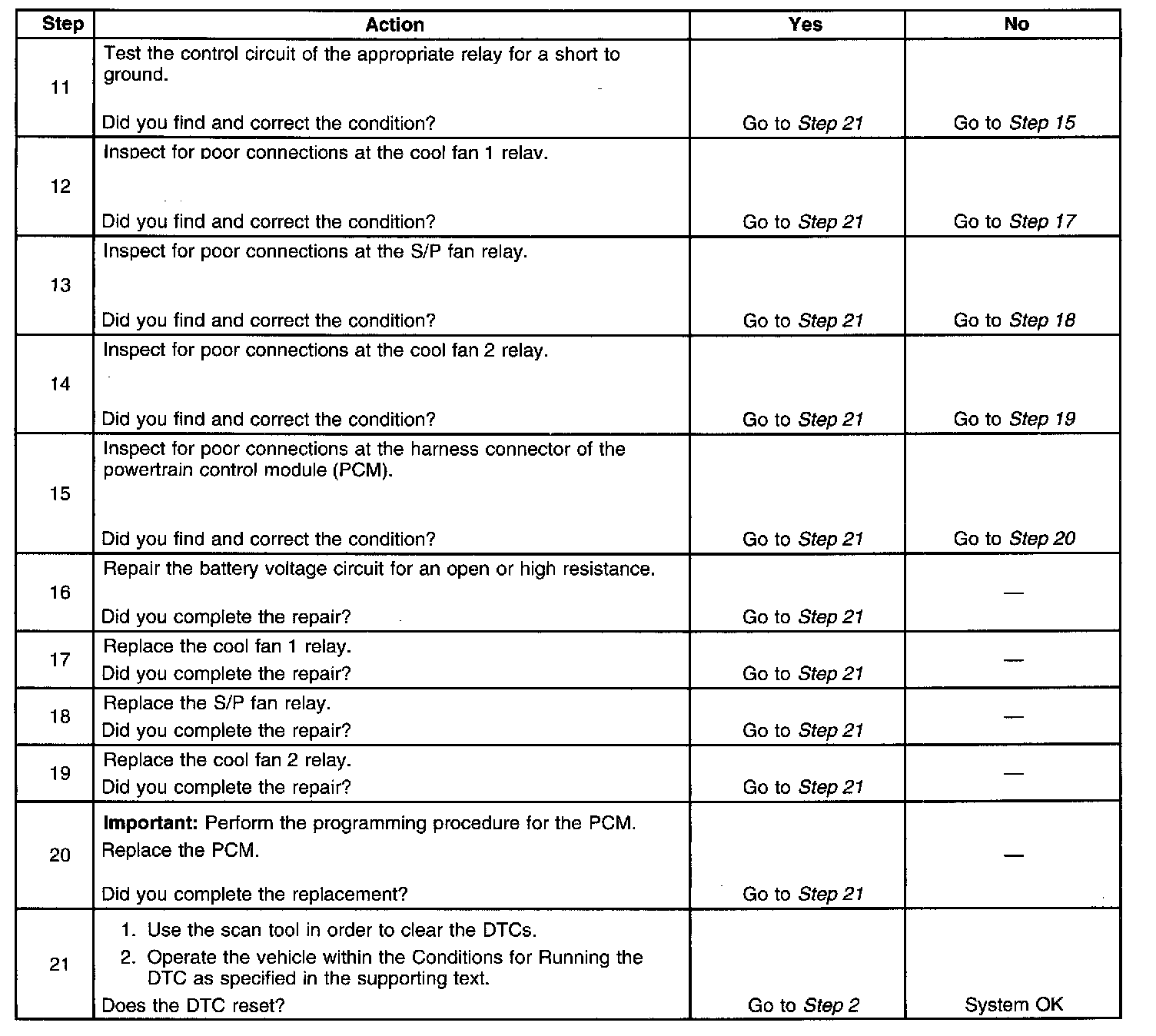 The powertrain control module (PCM) controls the low speed cooling fan operation by grounding the low speed fan relay control circuit with an internal solid state device called a driver. For high speed cooling fan operation, the PCM grounds the high speed and S/P relay control circuit at the same time the low speed control circuit is grounded. Battery positive voltage is supplied to the low speed, high speed and S/P fan relays. When the PCM is commanding a fan relay ON, the voltage of the control circuit should be low, near 0 volts. When the PCM is commanding a fan relay OFF, the voltage potential of the control circuit should be high, near battery voltage. If the fault detection circuit senses a voltage other than what is expected, the DTC will set. The vehicle has DTCs which include DTC Symptoms. For more information on DTC Symptoms, refer to DTC Symptom Description in Vehicle DTC Information.