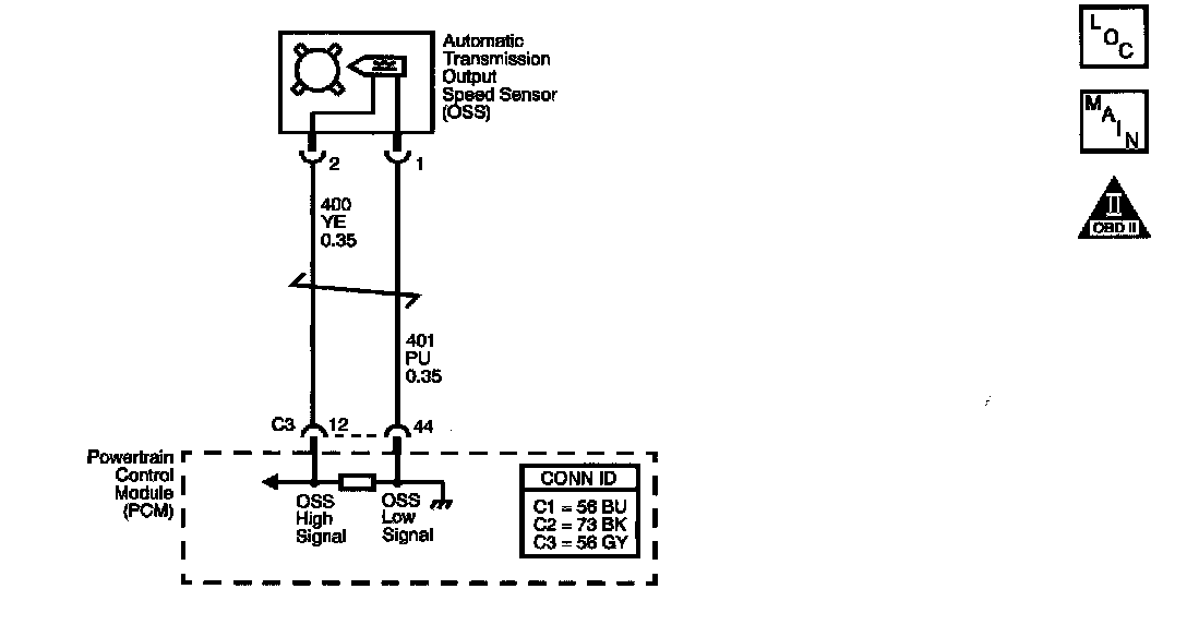 The automatic transmission Output Speed Sensor (OSS) provides vehicle speed information to the PCM. The OSS is a permanent magnet generator mounted to the transmission case. The OSS produces an AC voltage as the transmission speed sensor rotor teeth pass through the sensor's magnetic field. The AC voltage level increases as the speed of the vehicle increases. The PCM converts the AC voltage into a digital signal. The PCM uses the vehicle speed signal to determine shift timing, Torque Converter Clutch (TCC) apply, TCC release, and gear ratio calculations.
