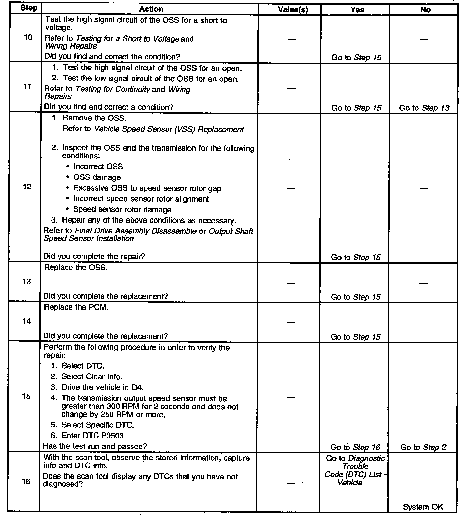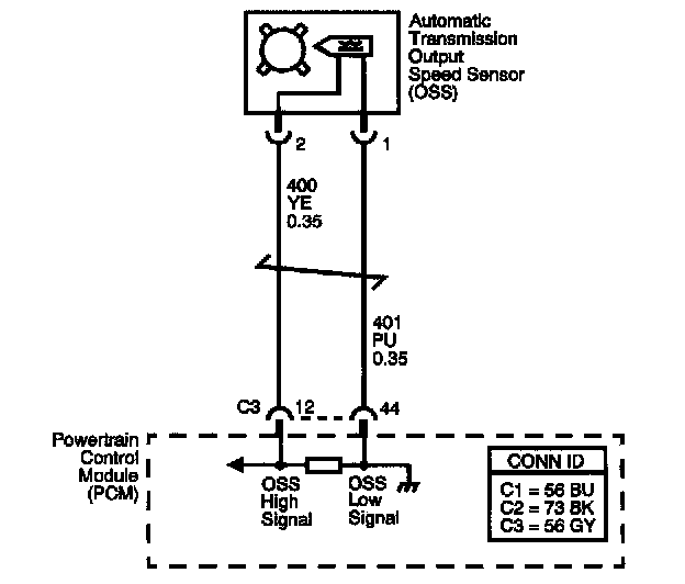 The automatic transmission Output Speed Sensor (OSS) provides vehicle speed information to the PCM. The OSS is a permanent magnet generator mounted to the transmission case. The OSS produces an AC voltage as the transmission speed sensor rotor teeth pass through the sensor's magnetic field. The AC voltage level increases as the speed of the vehicle increases. The PCM converts the AC voltage into a digital signal. The PCM uses the vehicle speed signal to determine shift timing, Torque Converter Clutch (TCC) apply, TCC release, and gear ratio calculations. When the PCM detects a loss of vehicle speed while the vehicle is in motion, then DTC P0503 sets. DTC P0503 is a type B DTC.
