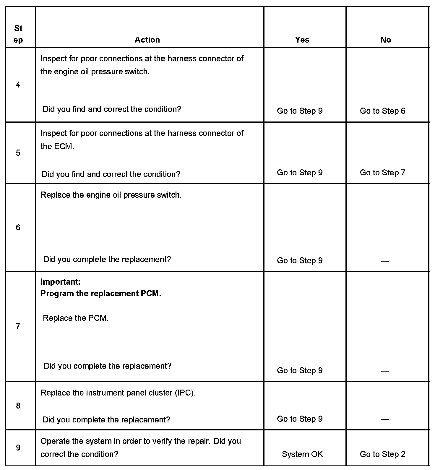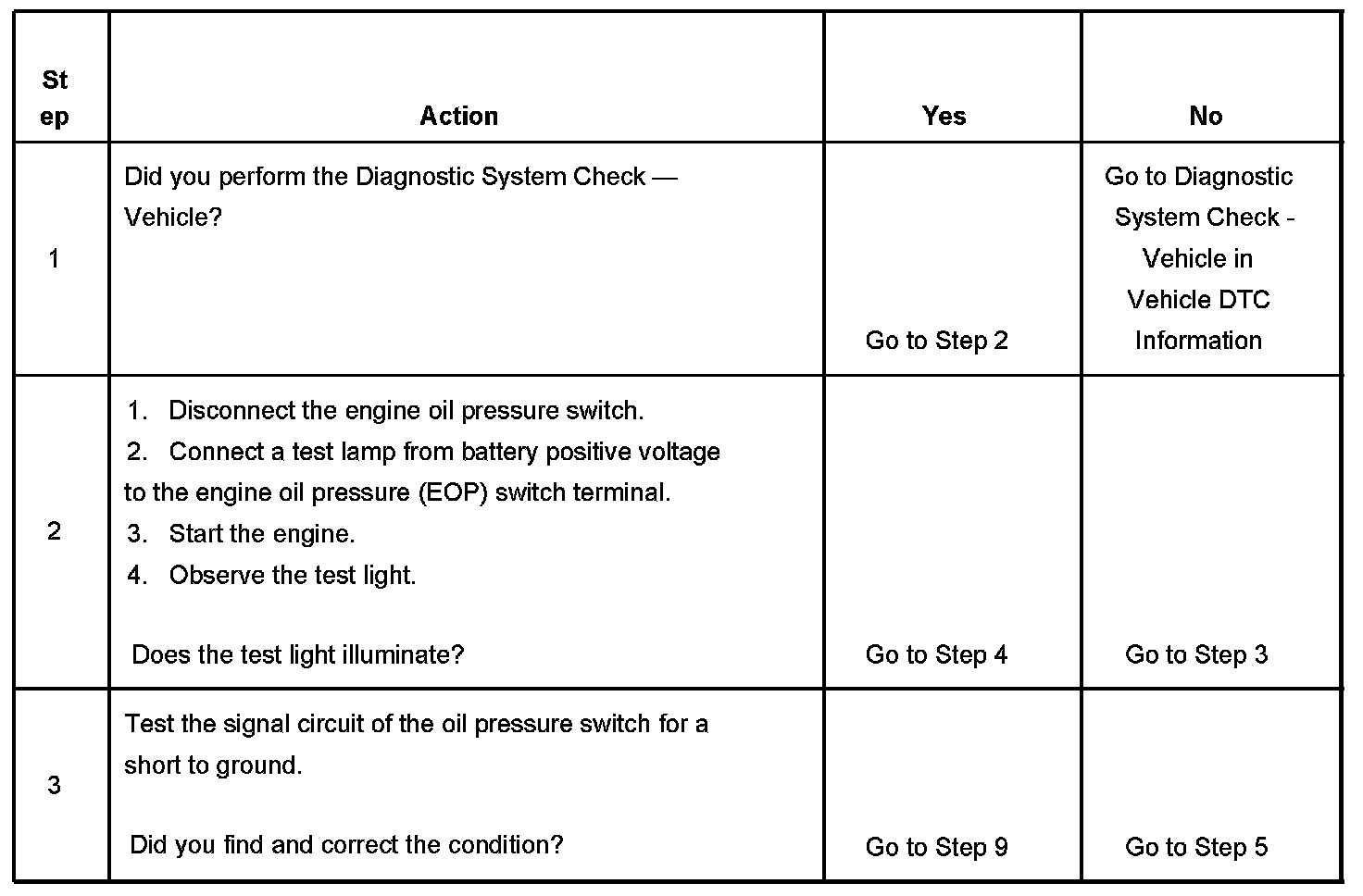 The powertrain control module (PCM) monitors the signal circuit of the engine oil pressure (EOP) sensor. When the oil pressure is high, the sensor is open, and the ECM senses a high signal voltage. When the oil pressure is low, the sensor is closed, and the ECM senses a low signal voltage.
