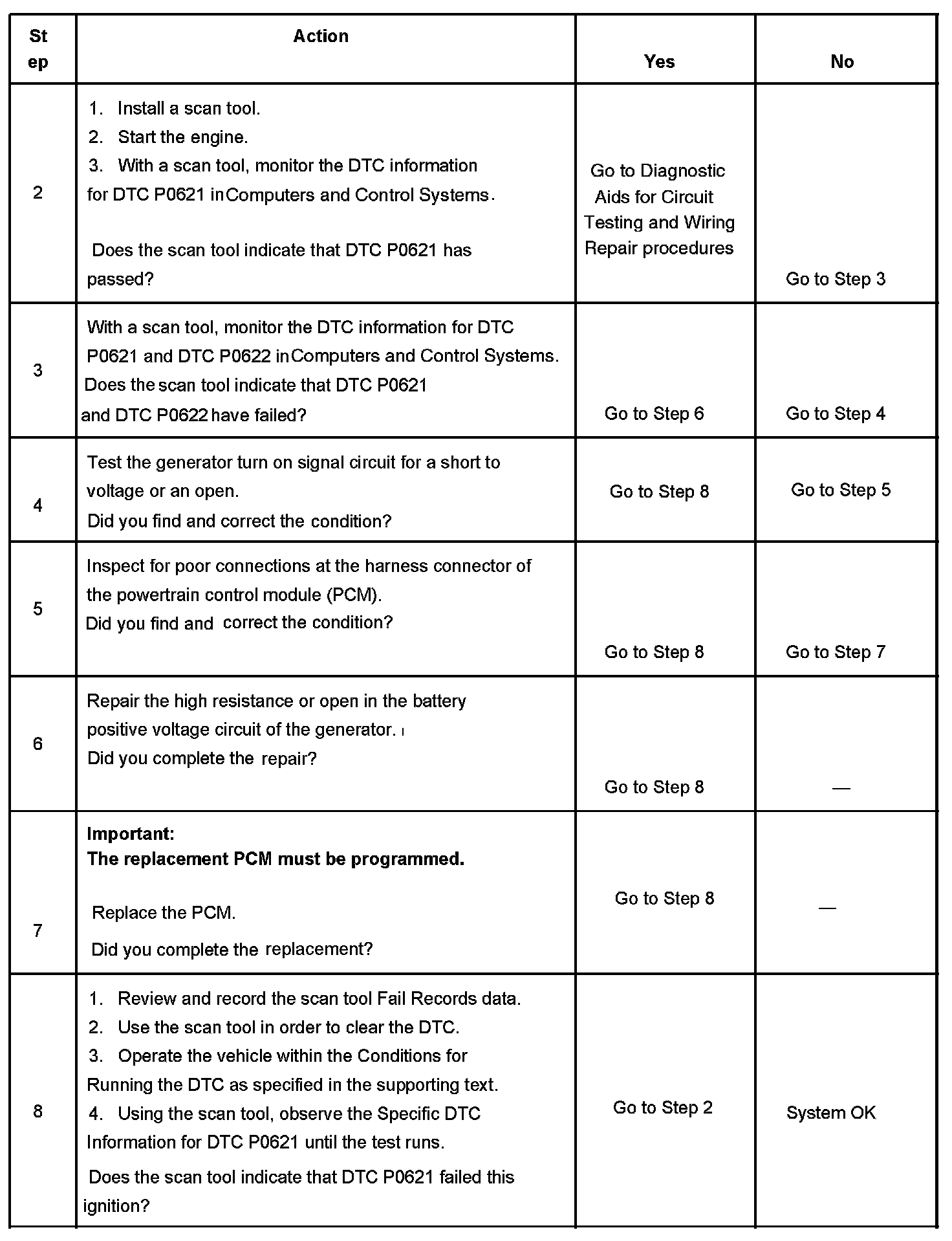 The PCM performs key ON and RUN tests to determine the status of the generator turn on signal circuit. During the key ON test, if the PCM detects a high generator turn on signal circuit voltage, DTC P0621 will set. DTC P0621 will also set if, during the RUN test, the PCM detects a low generator turn on signal circuit. When the DTC sets, the PCM will send a serial data message to the IPC to illuminate the charge indicator.