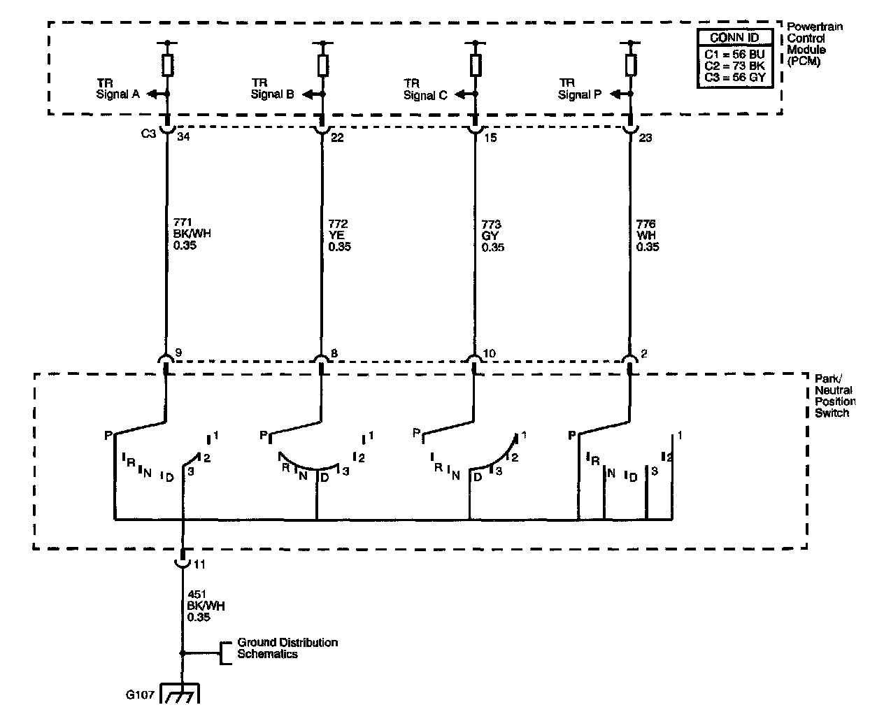 The Transmission Range (TR) switch is part of the park/neutral position and back-up lamp switch assembly and is mounted on the transmission manual shaft. The TR switch is a multi-signal switch. The PCM supplies ignition voltage to the TR switch on four signal circuits, A, B, C, and P. Each gear selector lever position grounds one or more of the signal circuits in a unique pattern. In order to determine the gear range selected by the driver, the PCM compares the voltage combination on the signal circuits to a TR switch combination table stored in memory.