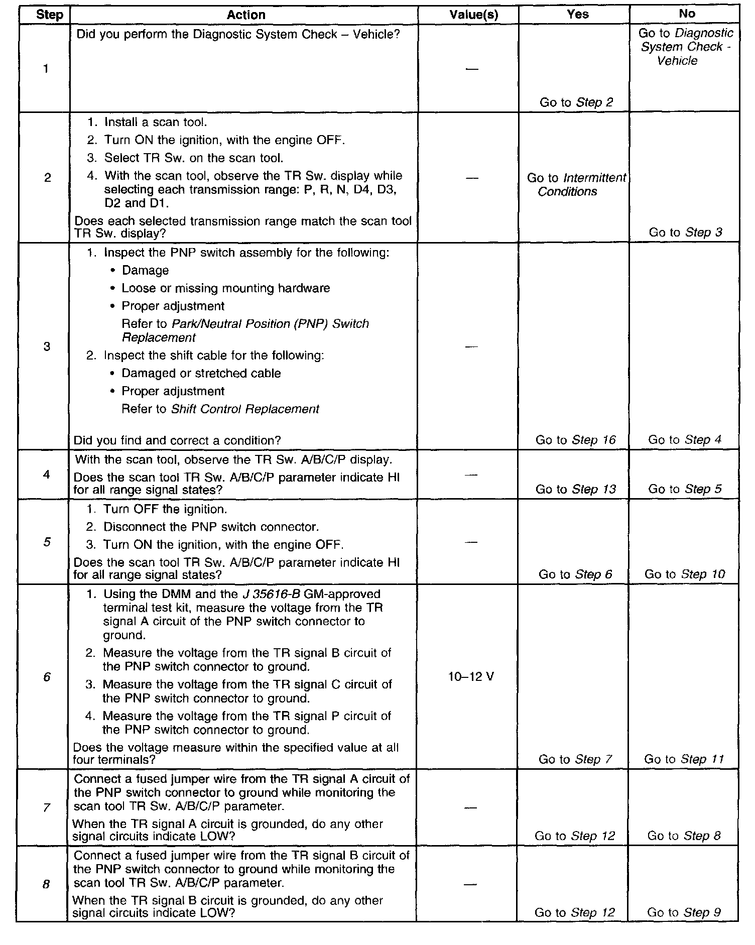 6. This step tests the TR switch wiring for an open or lack of signal voltage from the PCM.