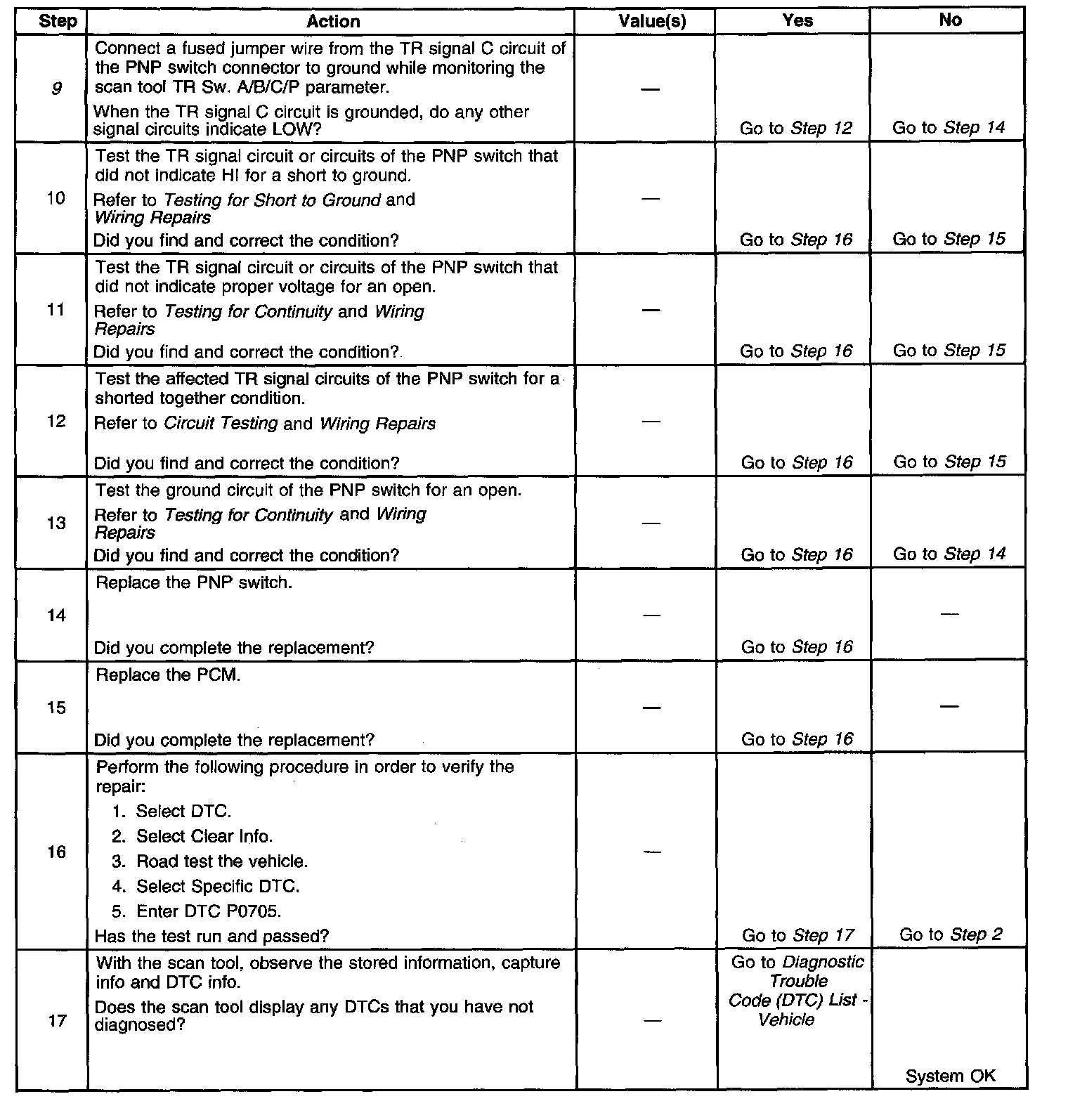When the PCM detects an invalid combination of TR switch signals, then DTC P0705 sets. DTC P0705 is a type C DTC.