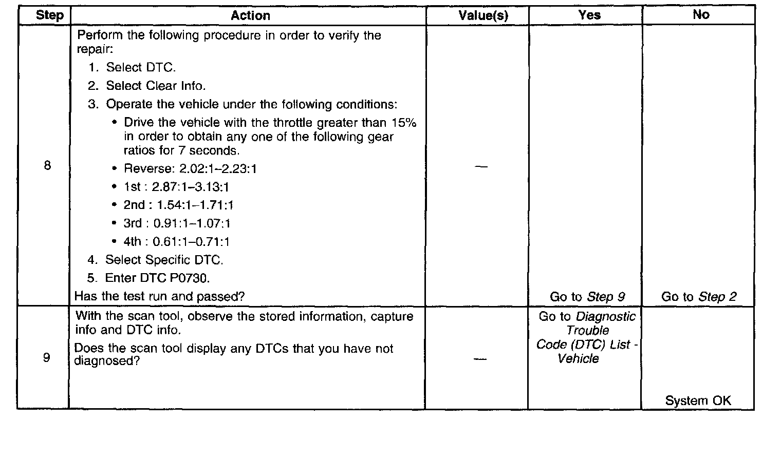 The PCM calculates gear ratio based on the transmission input and output speeds. The PCM compares the known transmission gear ratio to the calculated ratio for the selected gear range. When the PCM detects an unknown transmission gear ratio, then DTC P0730 sets. DTC P0730is a type C DTC.