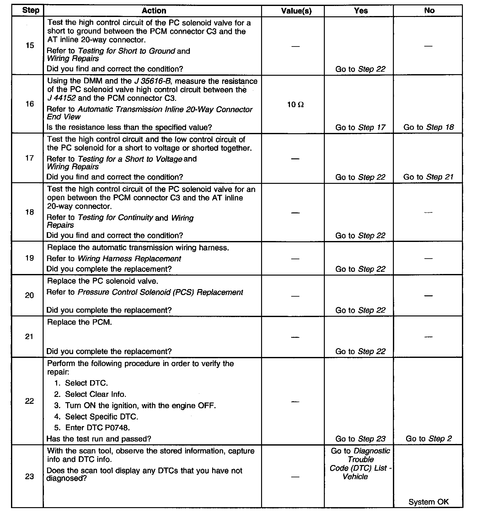 When the PCM detects a continuous open, short to ground or short to voltage in the PC solenoid valve circuit, then DTC P0748 sets. DTC P0748 is a type C DTC.