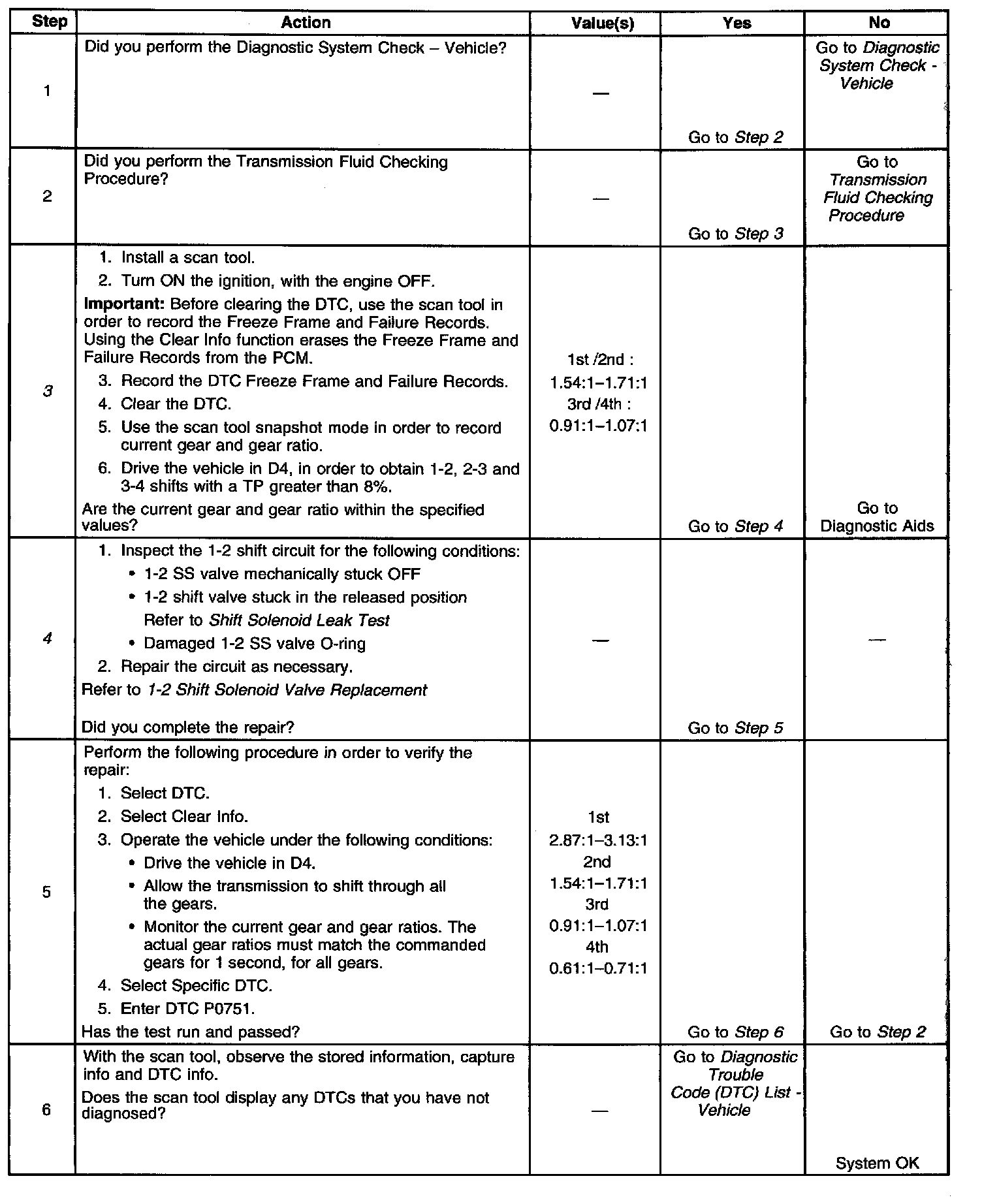 The 1-2 Shift Solenoid (SS) valve is a normally-open exhaust valve that, in conjunction with the 2-3 Shift Solenoid (SS) valve, allows four different shifting combinations. The 1-2 SS valve is attached to the control valve body, within the transmission. The PCM monitors the actual gear ratio, and compares the actual gear ratio with the commanded gear ratio. DTC P0751 sets under two conditions: