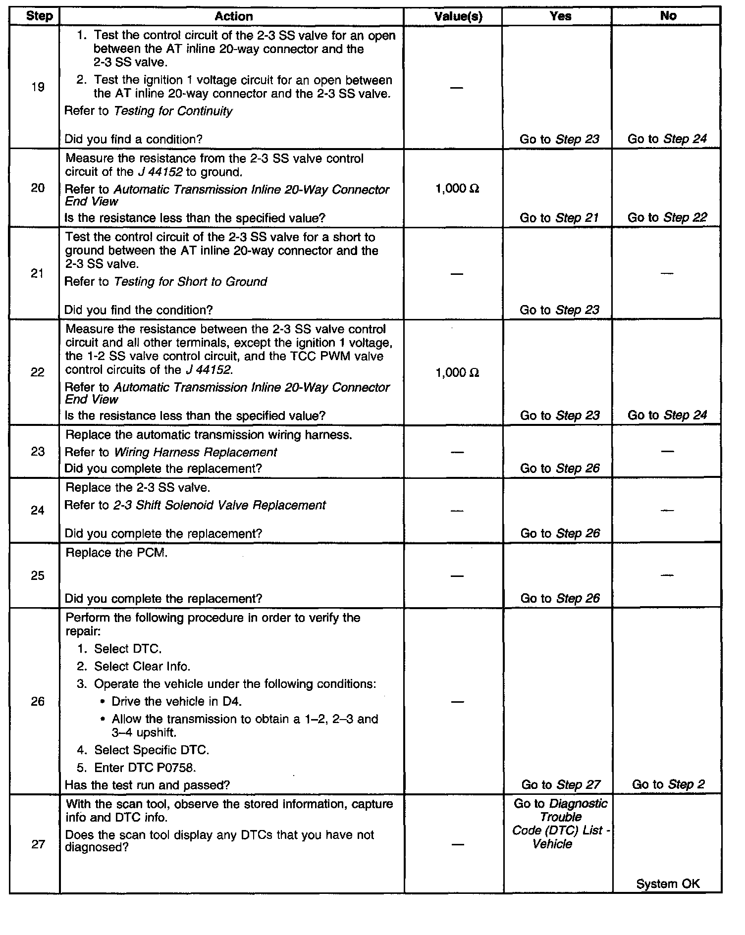 When the PCM detects a continuous open, short to ground, or short to voltage in the 2-3 SS valve circuit, then DTC P0758 sets. DTC P0758 is a type A DTC.