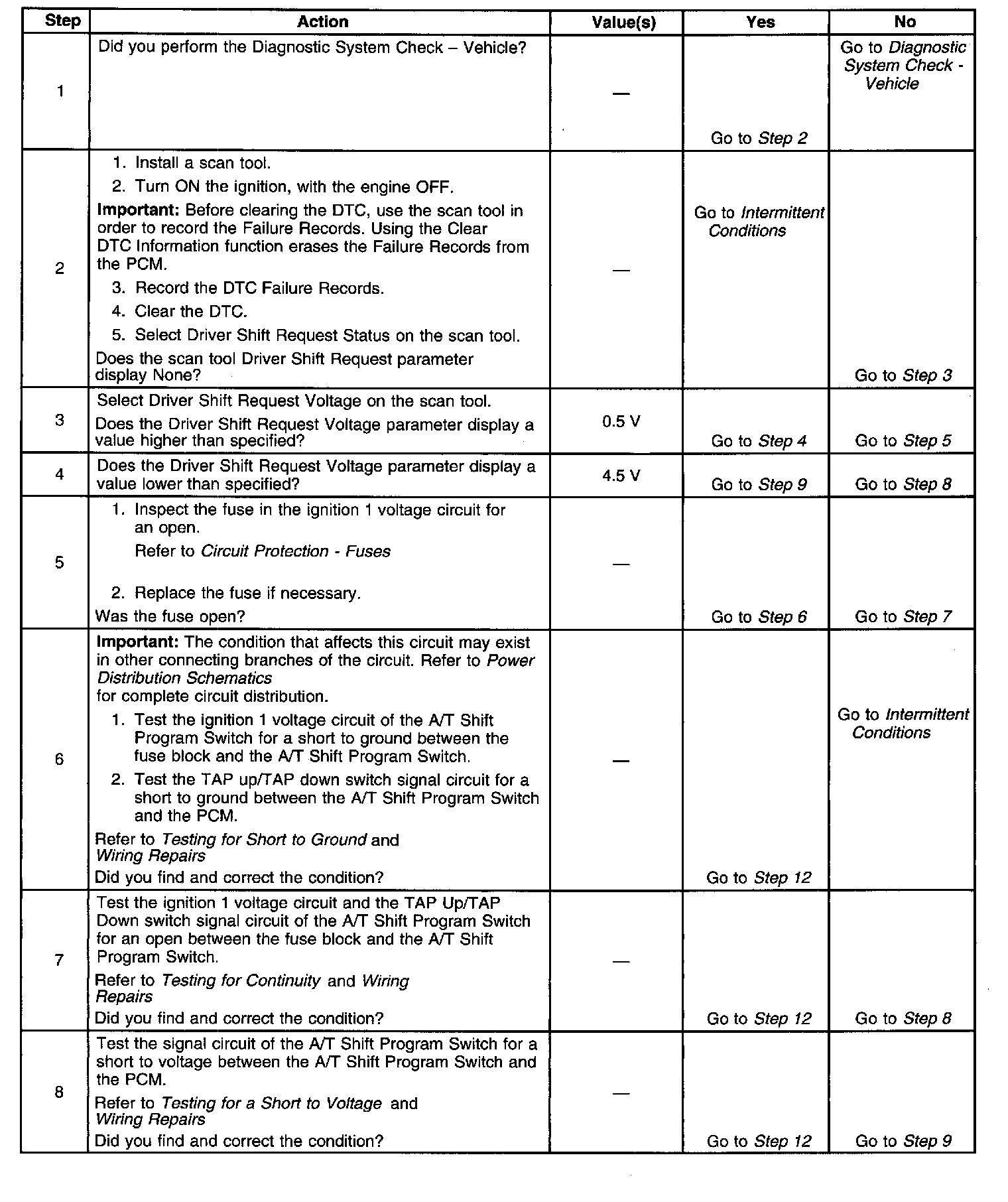 The TAP Shift system allows the driver to manually shift gears by using the TAP Shift switches located on the Automatic Transmission Shifter. Pushing the Up switch will command an upshift and pushing the Down switch will command a downshift. The TAP Shift system is activated when the gear selector is in the Low (L) position and is deactivated in all other positions. If the PCM detects an invalid voltage on the TAP up/TAP down switch signal circuit, then DTC P0826 sets. DTC P0826 is a type C DTC.