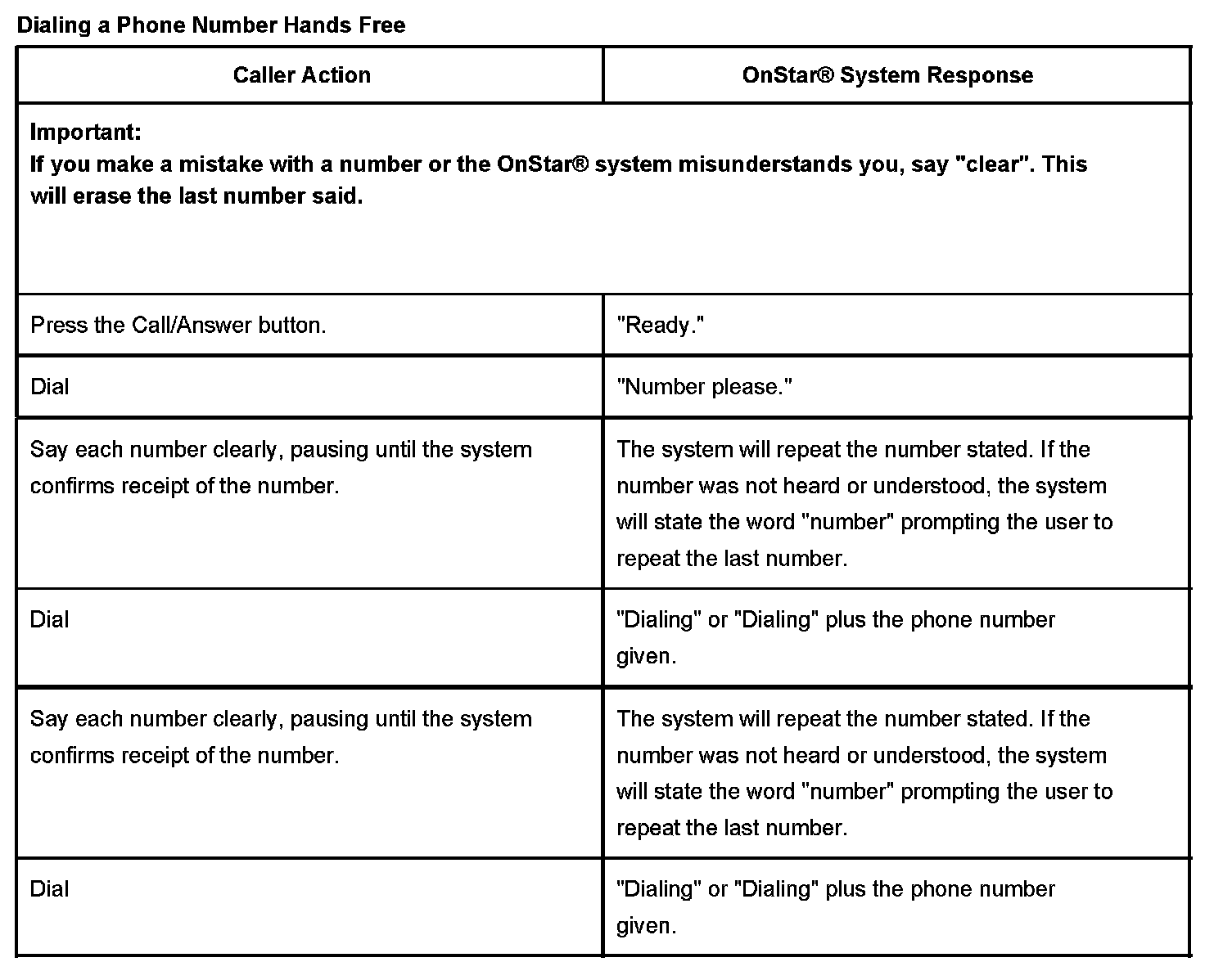 During a hands free call, the microphone and audio system operate the same way as a standard OnStar(R) call. When the answer/end call button is pressed, the audio system will mute; the OnStar(R) system will then return the prompt "OnStar Ready". At this point there are specific commands set to initiate a cellular call. If the vehicle receives a call when the radio is on, the audio system will mute and an audible ring will be heard though the speakers. The call will be answered when the answer/end call button is pressed.