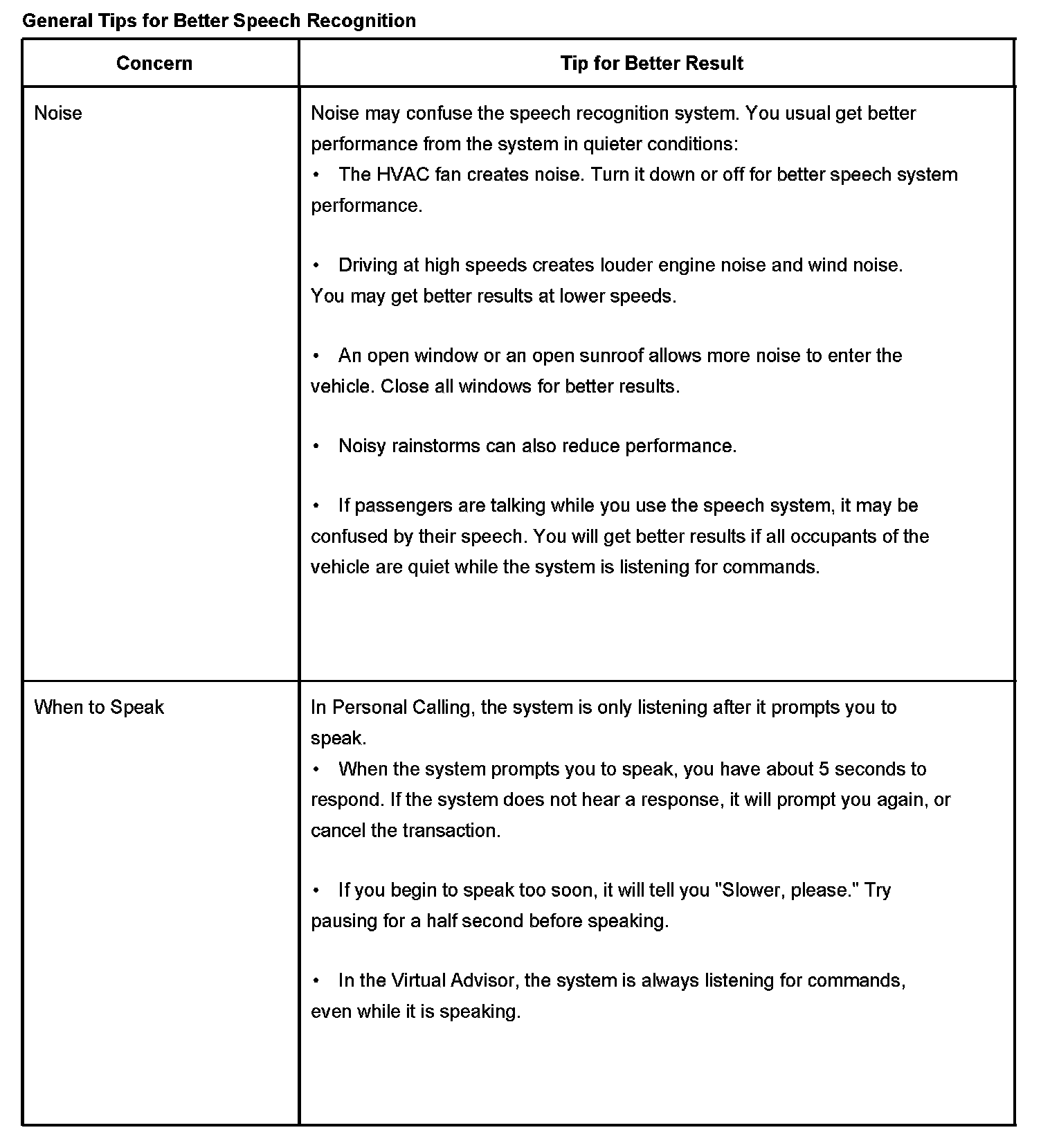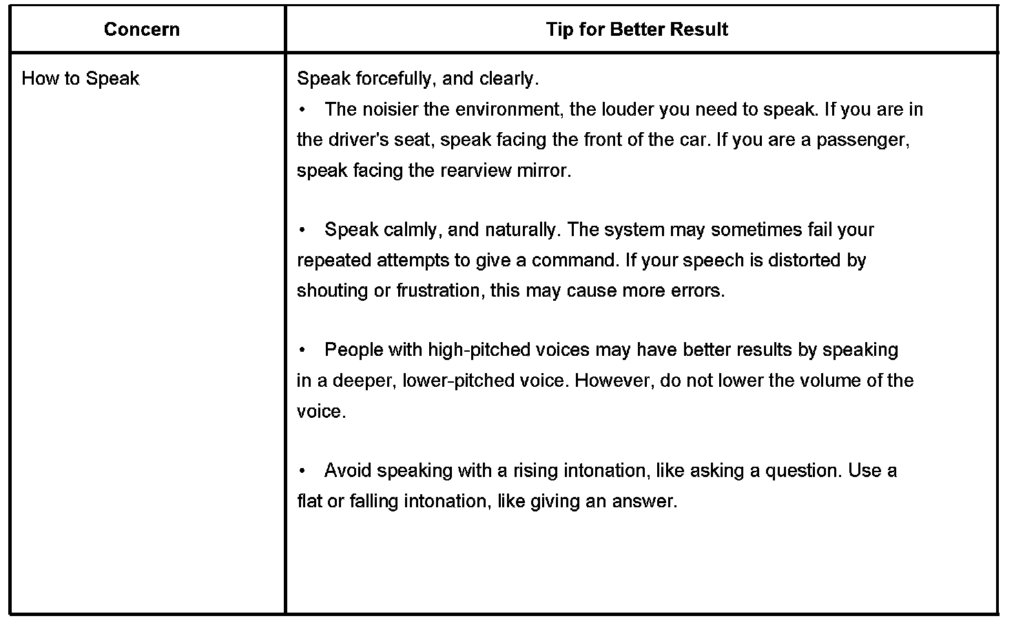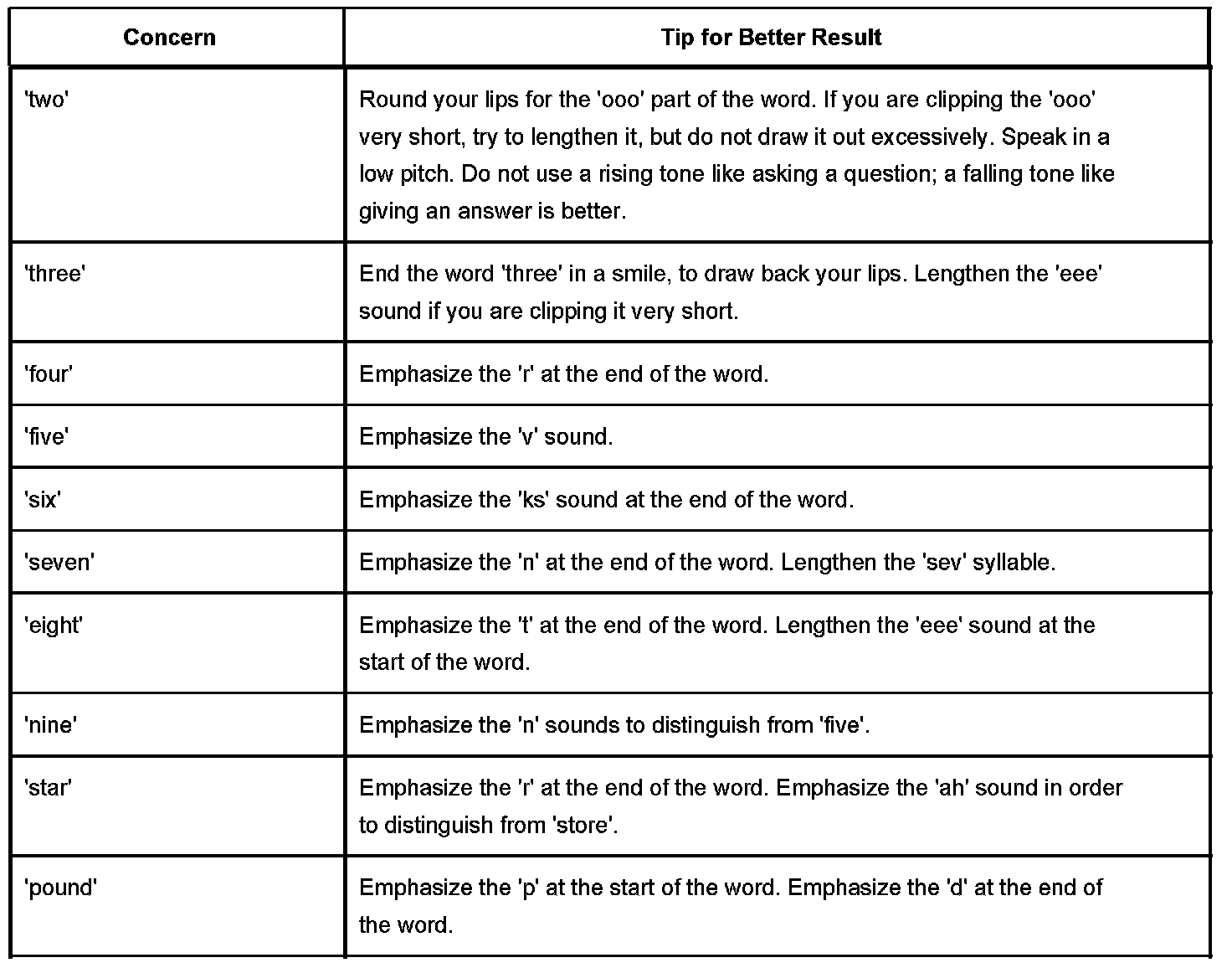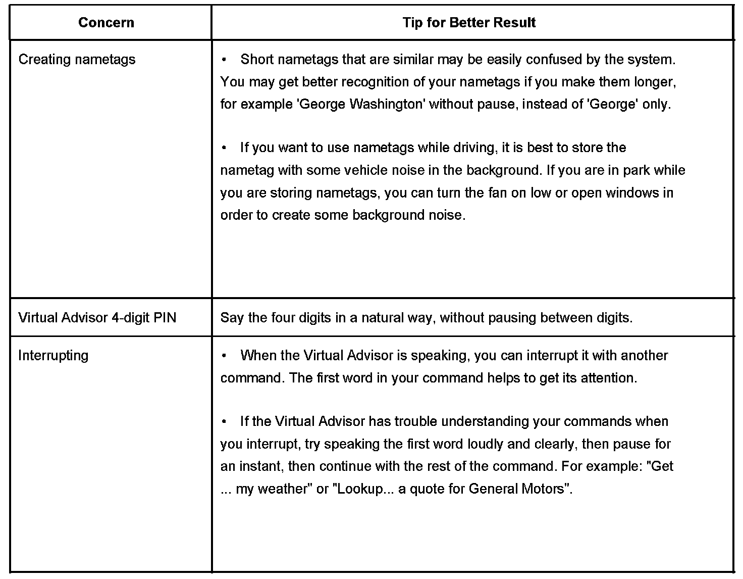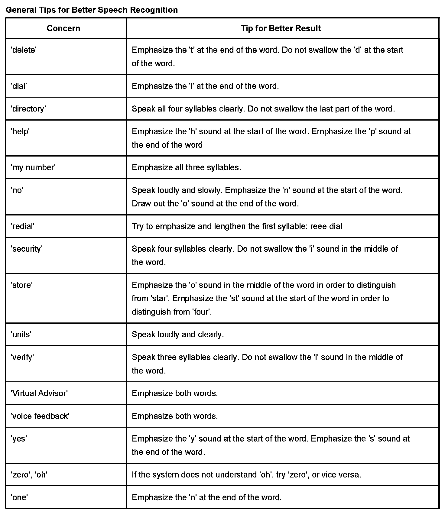 The OnStar(R) speech recognition systems use speech technology that is designed to understand a wide range of American English speakers. Although there is no one "right" way to speak English, the system will work best when users try to modify their pronunciation should they encounter difficulty. Users who do not obtain good results are advised to try the tips and "workarounds" found.