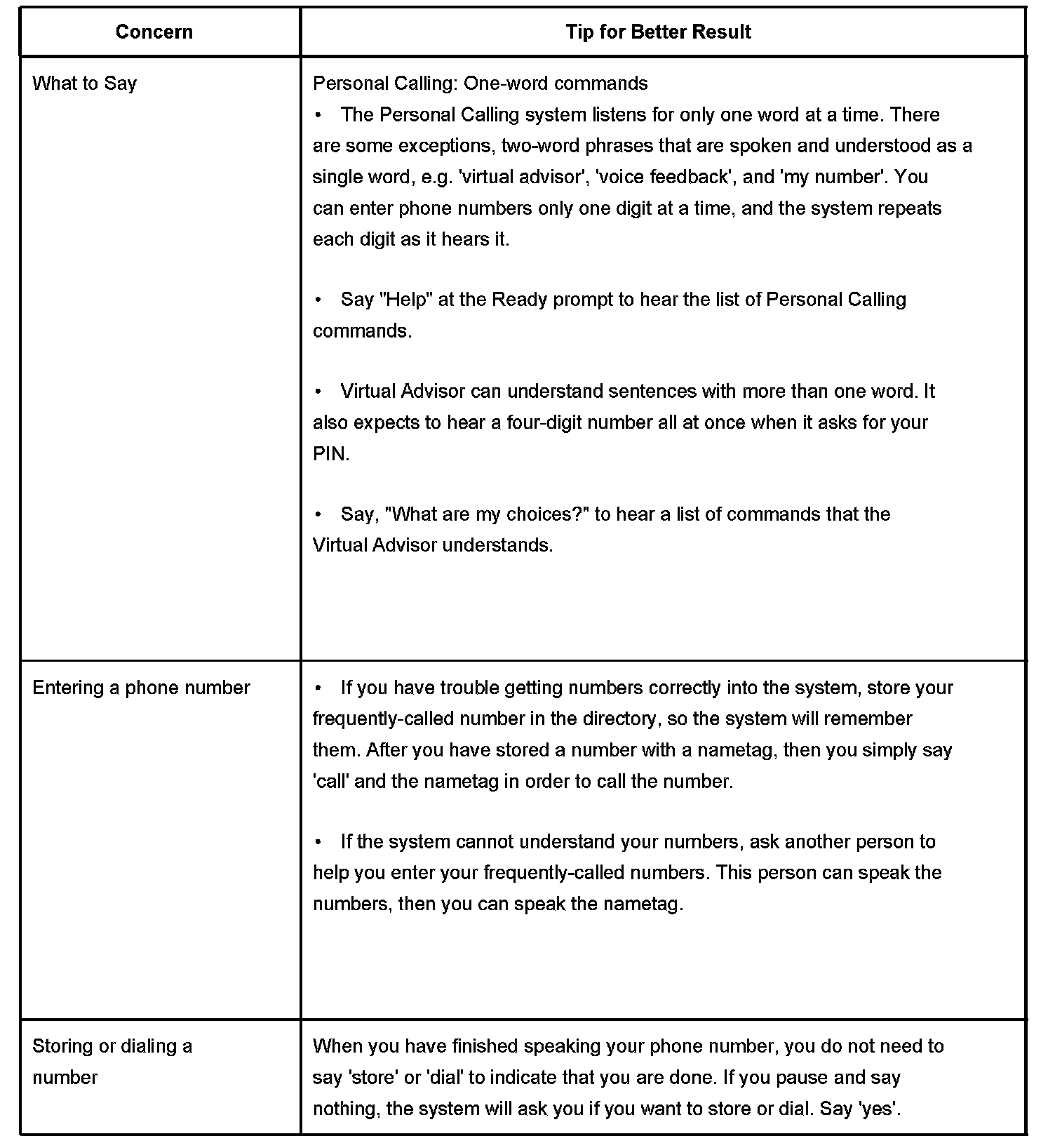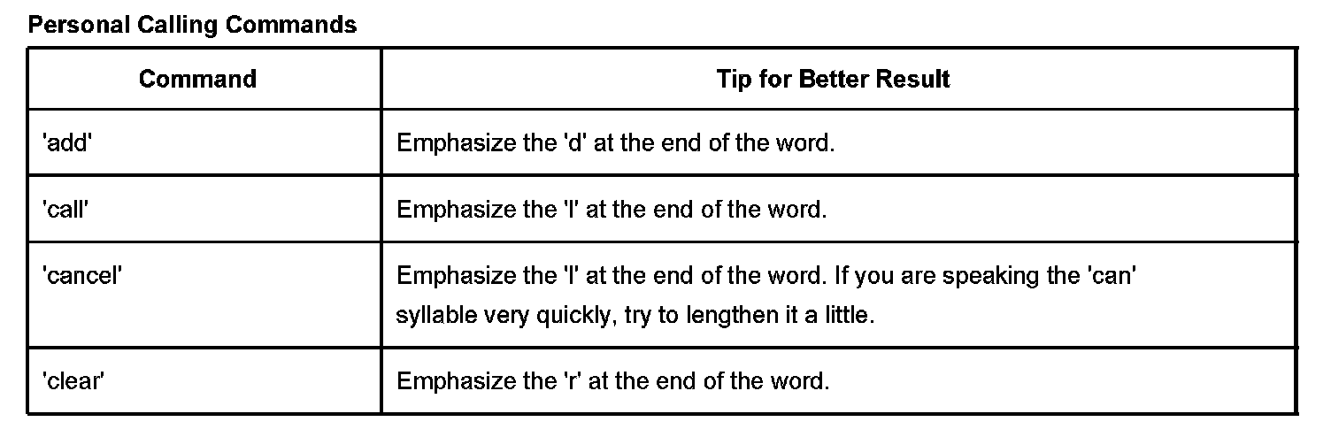 1. Personal Calling uses a speech recognition system that resides in the vehicle. When the user presses the dot button, the system states, "Ready", and listens for the user's command. The user can speak commands to control the hands-free phone.