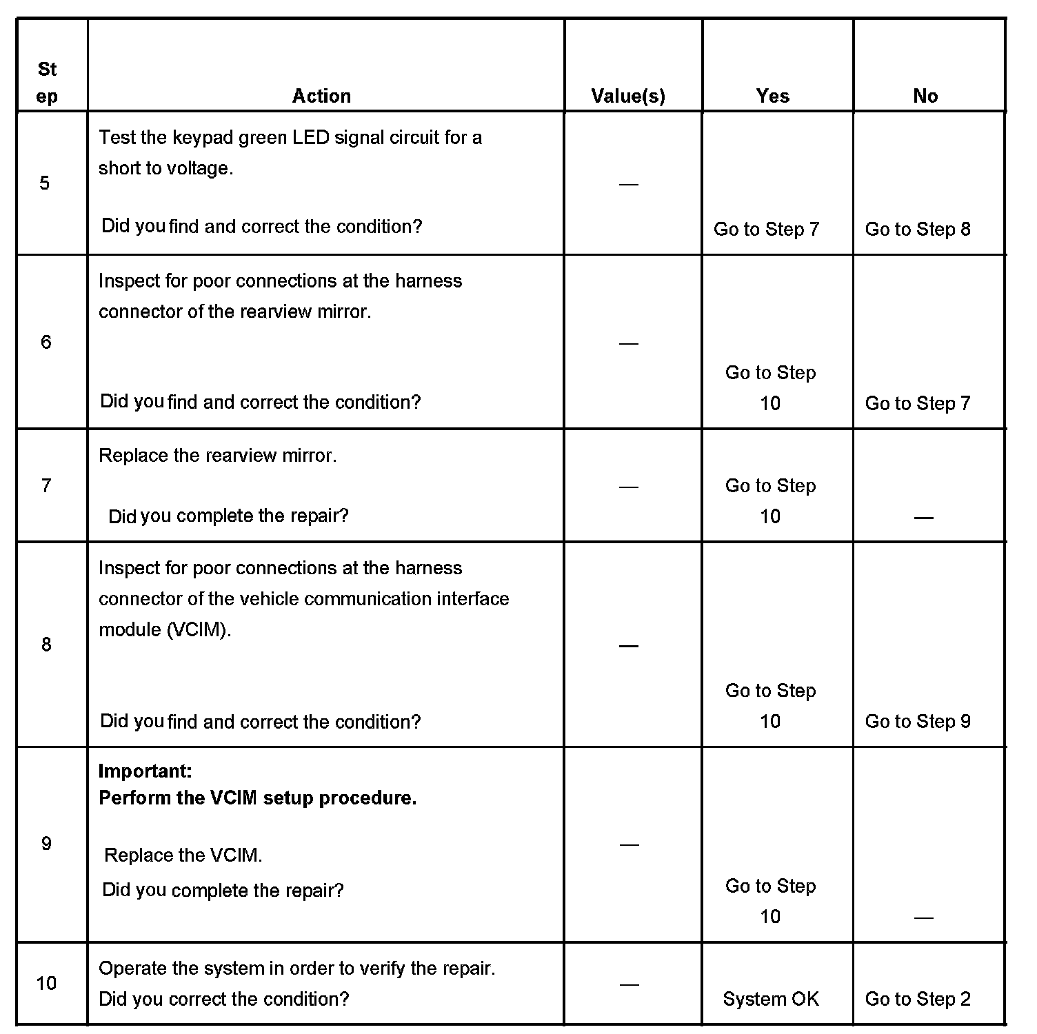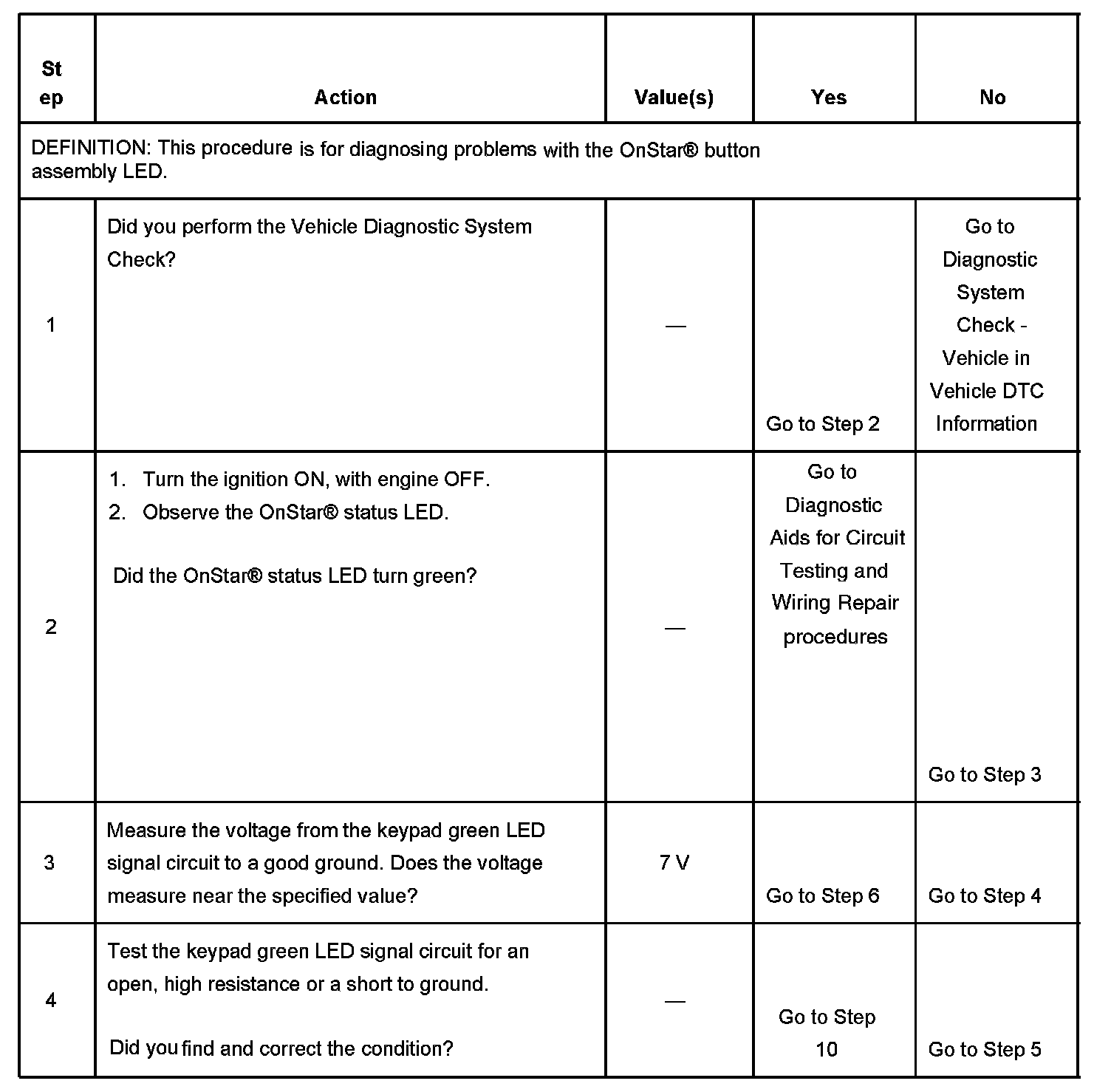 5. If the green LED signal is shorted to voltage then the OnStar(R) three button assembly has been damaged and the OnStar(R) three button assembly must be replaced.