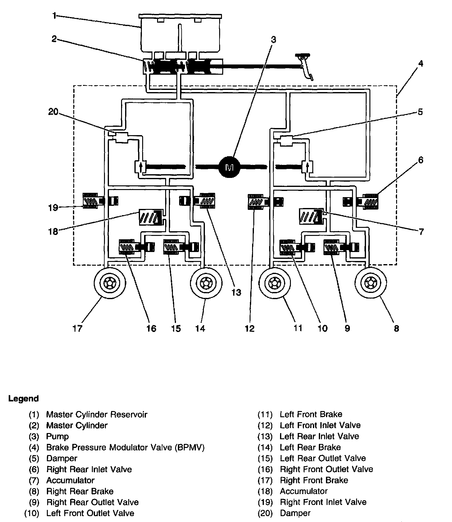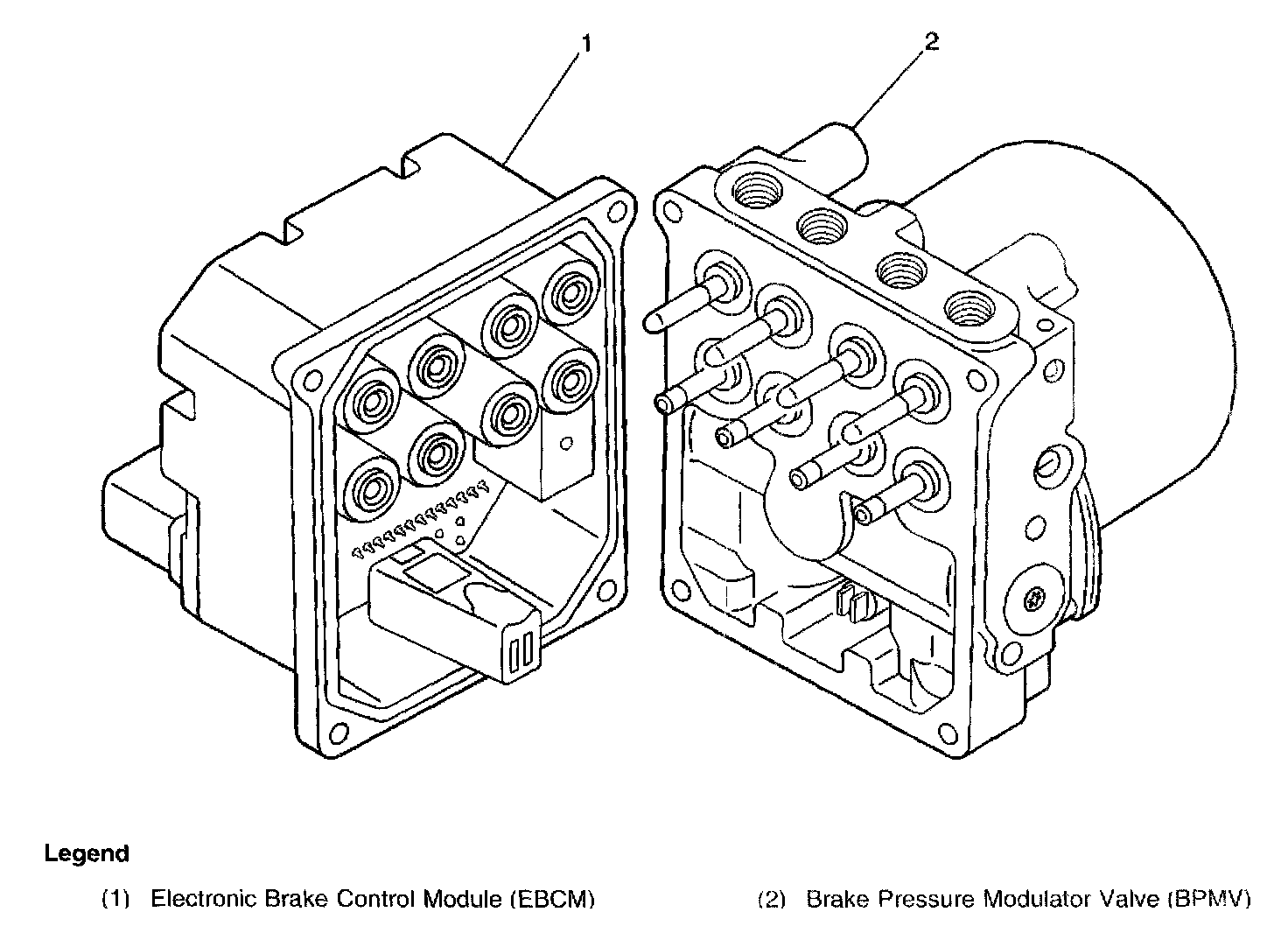 ^ Brake Pressure Modulator Valve (BPMV) - The BPMV contains the solenoid valves and pump motor that are controlled by the EBCM to isolate or release brake pressure to individual wheels.
