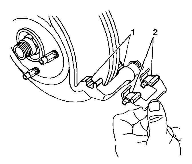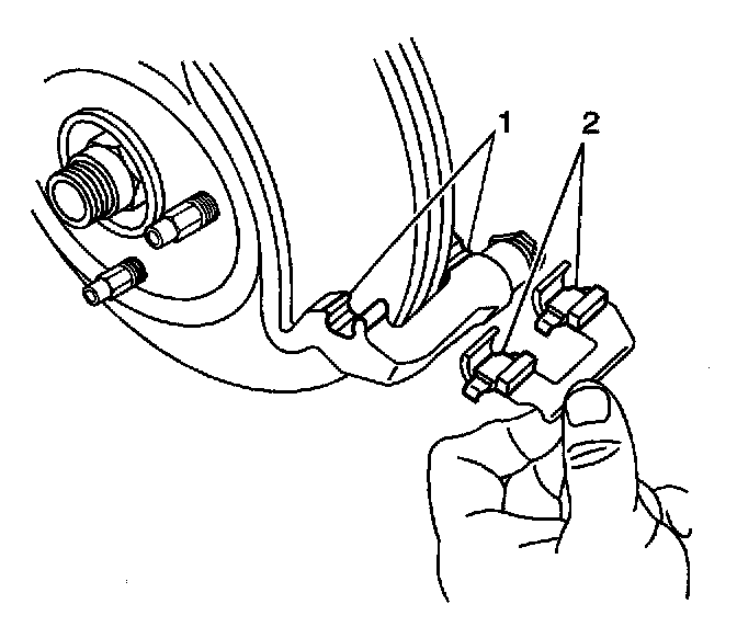 3. Remove the brake pad retainers (2) from the brake caliper bracket.