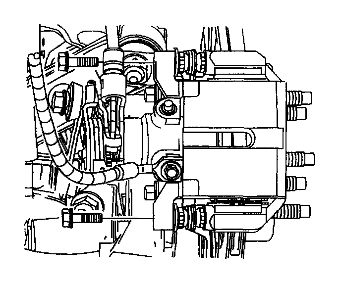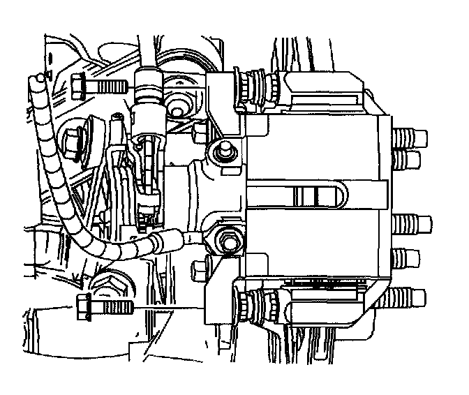 Notice: Support the brake caliper with heavy mechanic's wire, or equivalent, whenever it is separated from its mount and the hydraulic flexible brake hose is still connected. Failure to support the caliper in this manner will cause the flexible brake hose to bear the weight of the caliper, which may cause damage to the brake hose and in turn may cause a brake fluid leak.