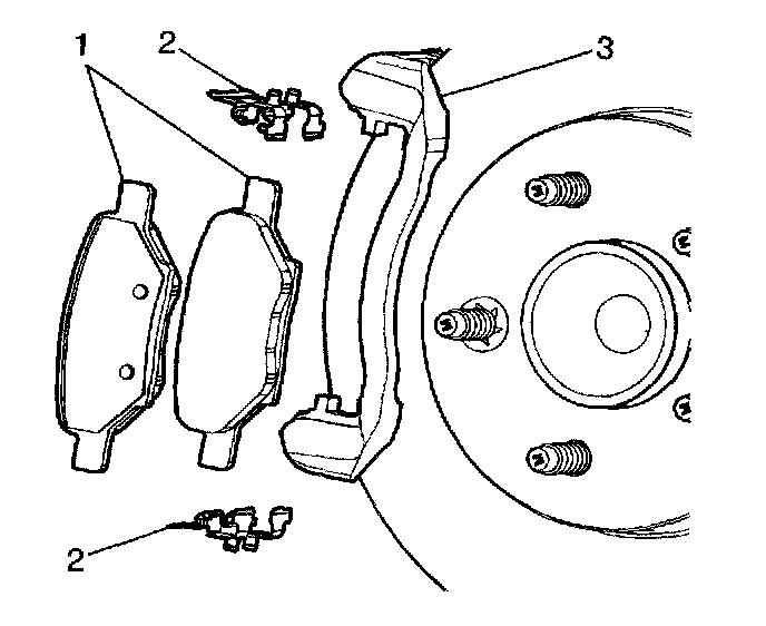8. Remove the brake pad retainers (2) from the brake caliper mounting bracket (3).