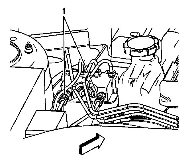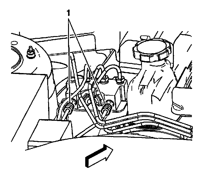 1. Disconnect the 2 brake pipes (1) from the proportioning valve. Use bleeder valve caps or similar caps to plug the ends of the brake pipes in order to prevent brake fluid from draining out of the pipes and to avoid brake fluid contamination.