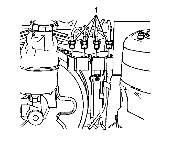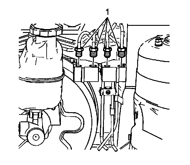 2. Disconnect the 4 brake pipes (1) from the proportioning valve. Use bleeder valve caps or similar caps to plug the ends of the brake pipes in order to prevent brake fluid from draining out of the pipes and to avoid brake fluid contamination.