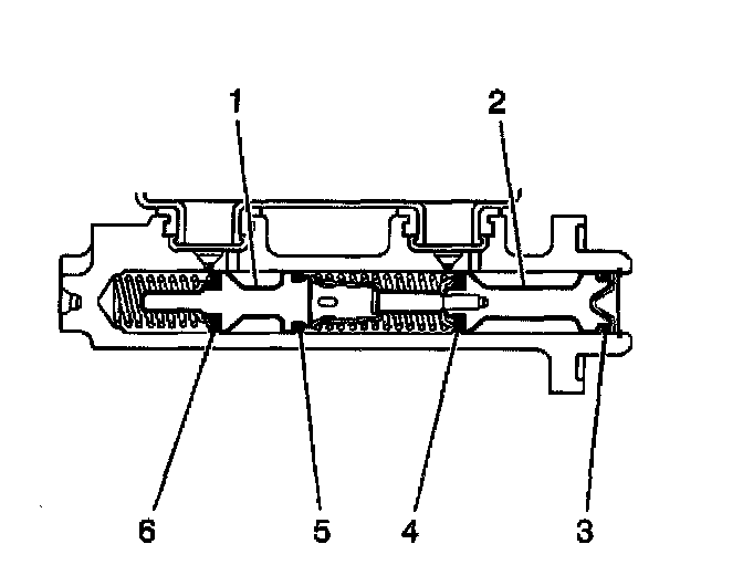 8. If the brake pedal apply did not feel spongy, and the brake pedal travel was initially steady and not excessive, but then gradually fell, then the master cylinder requires overhaul or replacement due to an internal leak past the secondary piston (1) from the secondary piston primary seal (6) or secondary seal (5).
