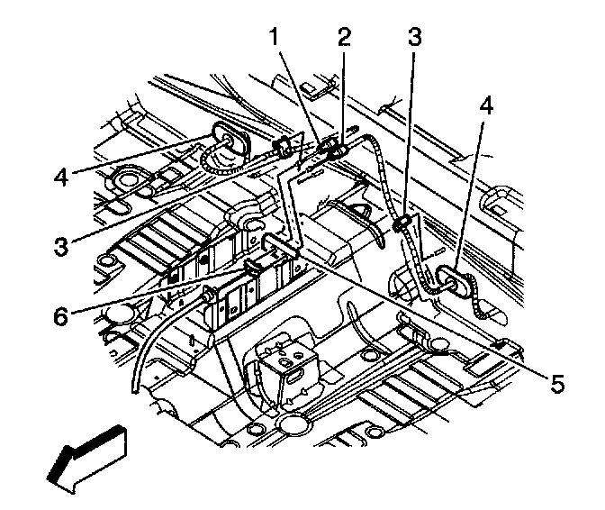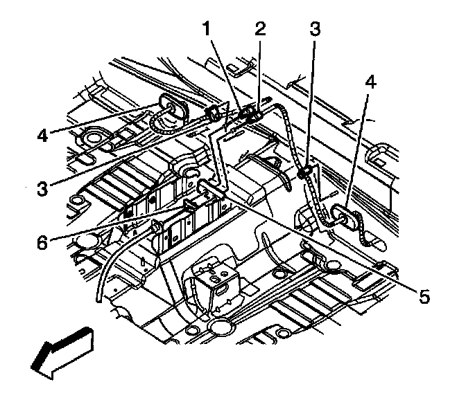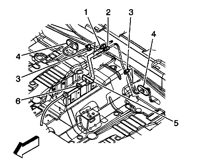 4. Remove the right rear park brake cable (1) or the left rear park brake cable (2) from the console park brake bracket (5) and the front park brake cable equalizer (6).