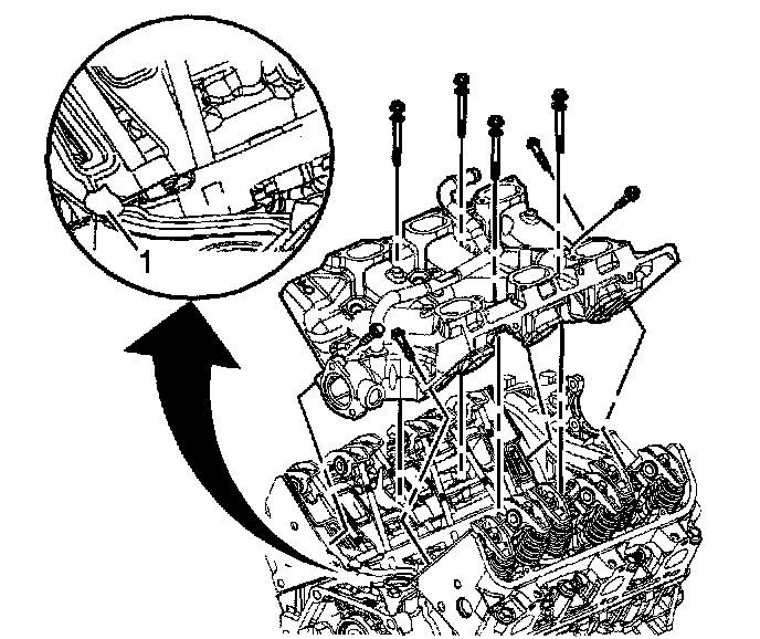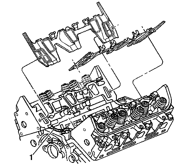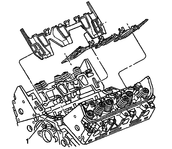 3. With gaskets and seals in place apply a small drop 8-10 mm (0.31-0.39 inch) of RTV sealer GM P/N 12378521 (Canadian P/N 88901148), or equivalent, to the 4 corners of the intake manifold to block joints (1).