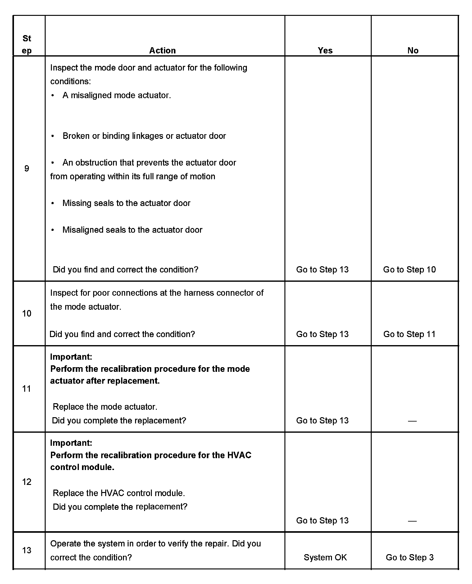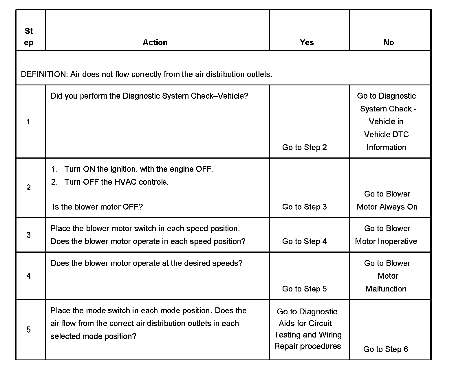 The numbers below refer to the step numbers on the diagnostic table.