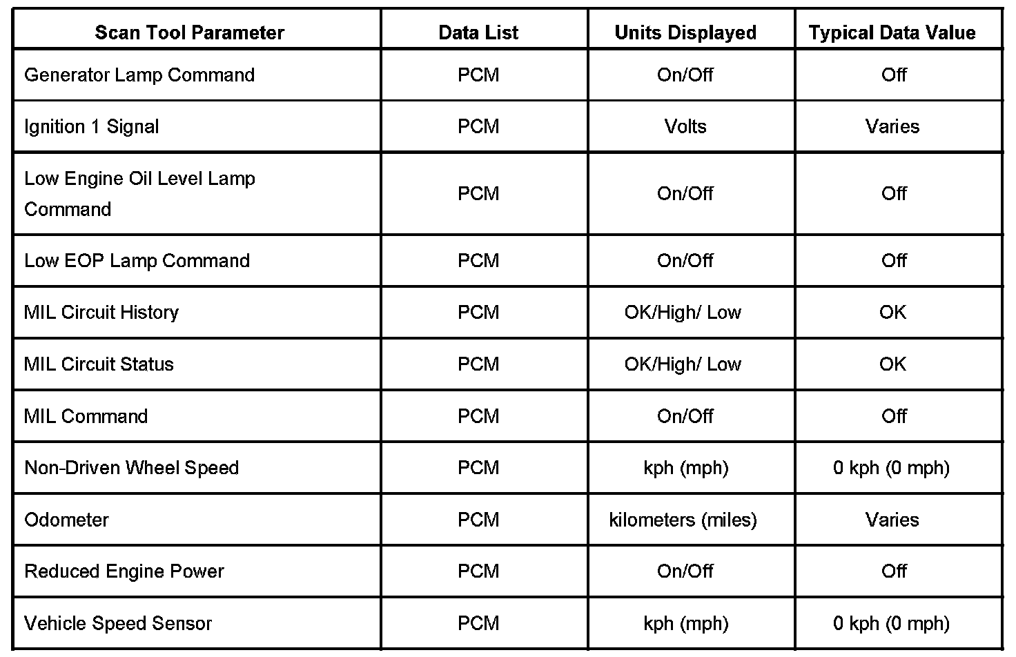 The typical data values are obtained from a properly operating vehicle under the conditions specified in the first row of the scan tool data list table.