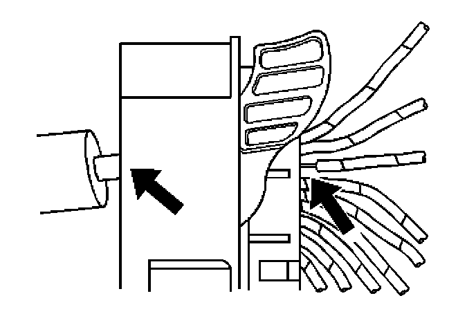 7. Insert the J 38125-13A (GM P/N 12031876-1) tool into the round canal between the terminals cavities at the front of the connector. See the release tool cross reference in the Reference Guide of the Terminal Repair Kit to ensure that the correct release tool is used.