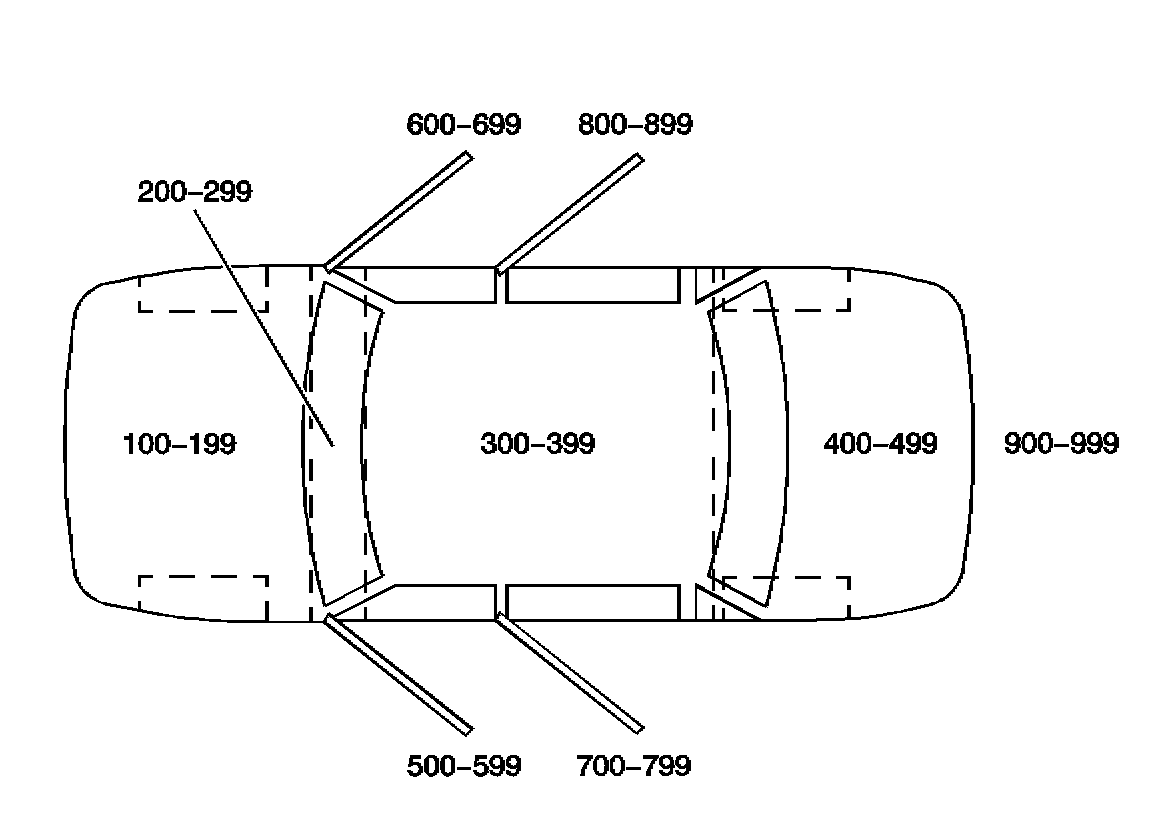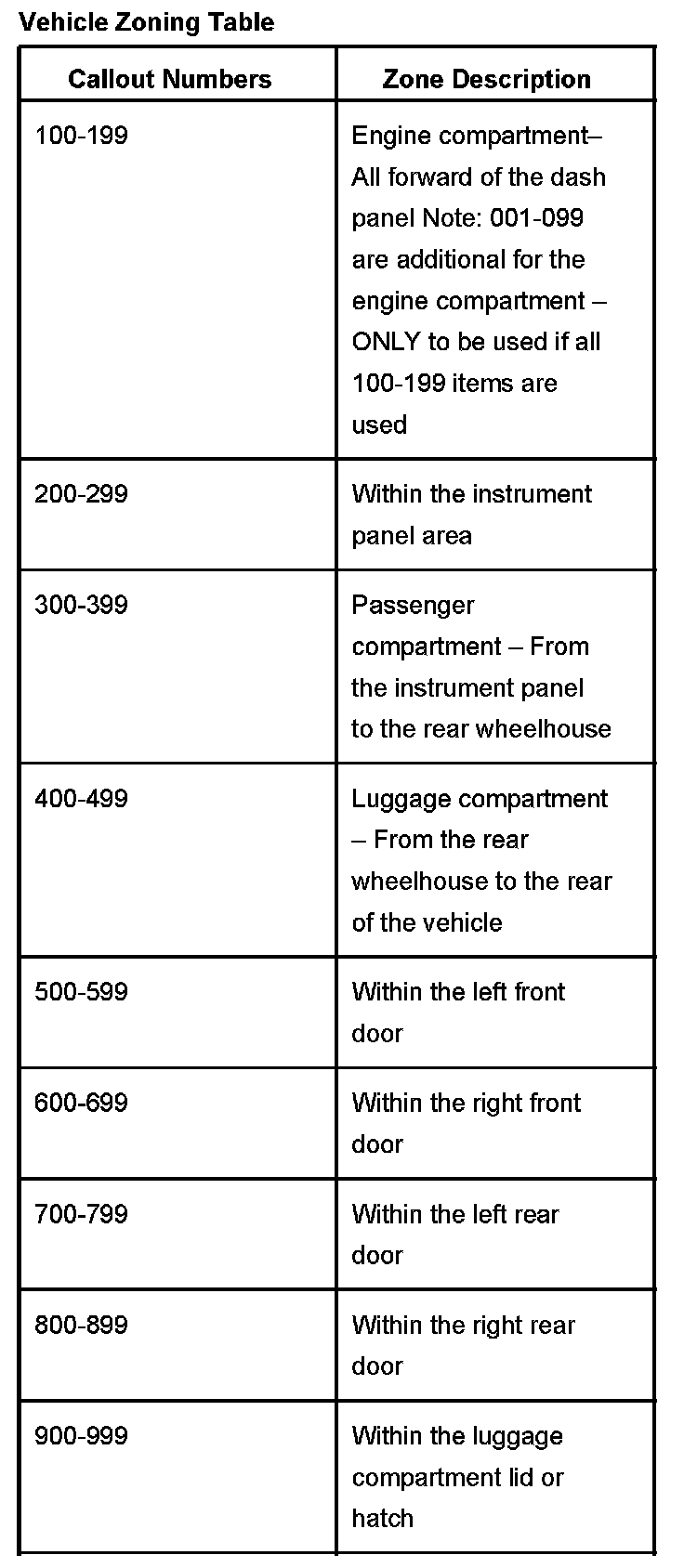 All grounds, in-line connectors, pass-through grommets, and splices have identifying numbers that correspond to where they are located in the vehicle. The table explains the numbering system.
