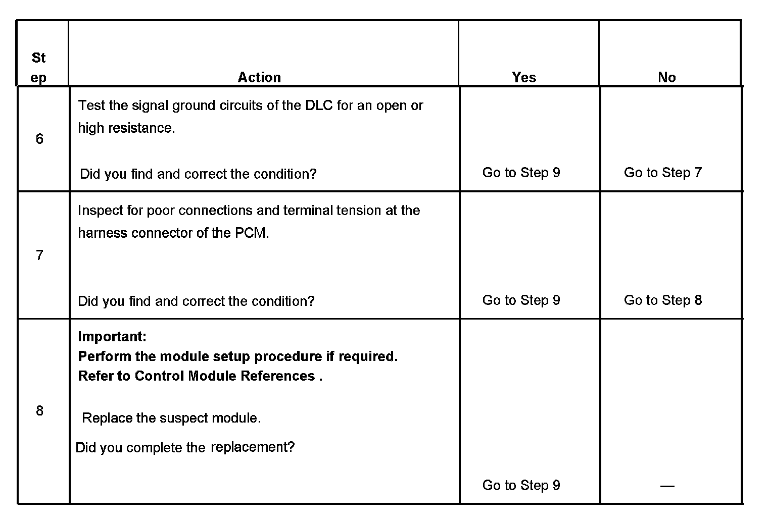 The numbers below refer to the step numbers on the diagnostic table.