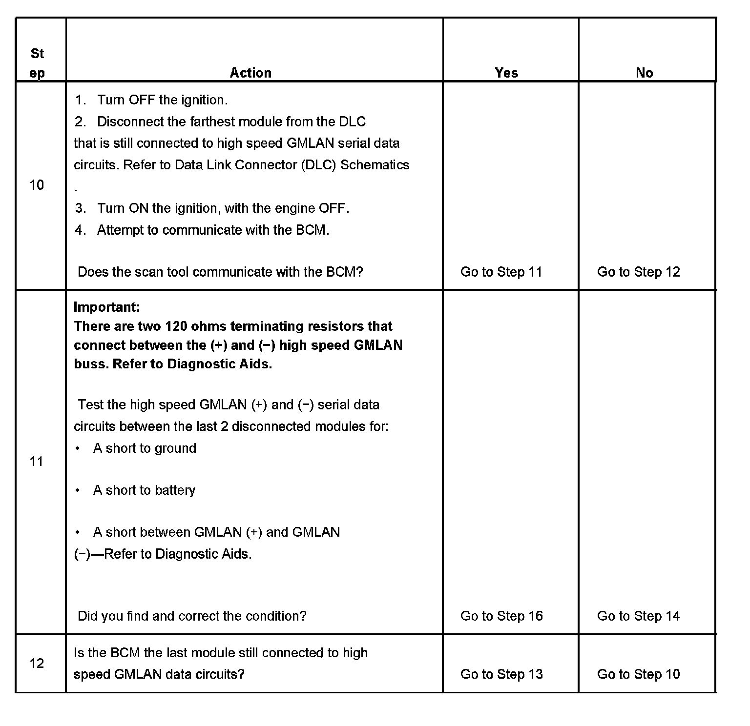 The high speed GMLAN serial data buss uses two 120 ohms terminating resistors that are in parallel with the high speed GMLAN (+) and (-) circuits. One of the resistors is connected at the data link connector (DLC) end of the link and the other is at the engine management module, engine control module (ECM) or powertrain control module (PCM), end of the link. The DLC terminating resistor resides internally in the BCM. When testing for a short between high speed GMLAN (+) and (-) with the engine management module removed, a reading off 120 ohms is normal. However, to completely analyze the buss the body control module (BCM) should be temporally removed when testing for shorts between the high speed GMLAN (+) and (-) while also making sure that all modules and the scan tool are disconnected from the buss. A normal reading across the high speed GMLAN buss with the terminating resistor at the DLC remove and all module and scan tool disconnected is infinite ohms. Make certain to reconnect the BCM after testing, it is necessary for proper vehicle powermoding.