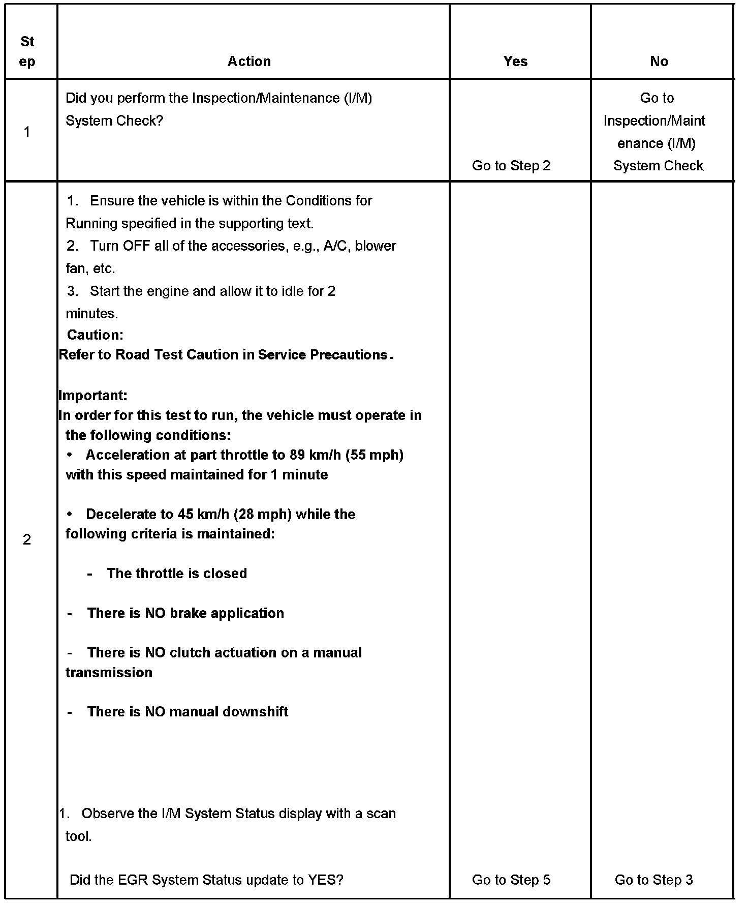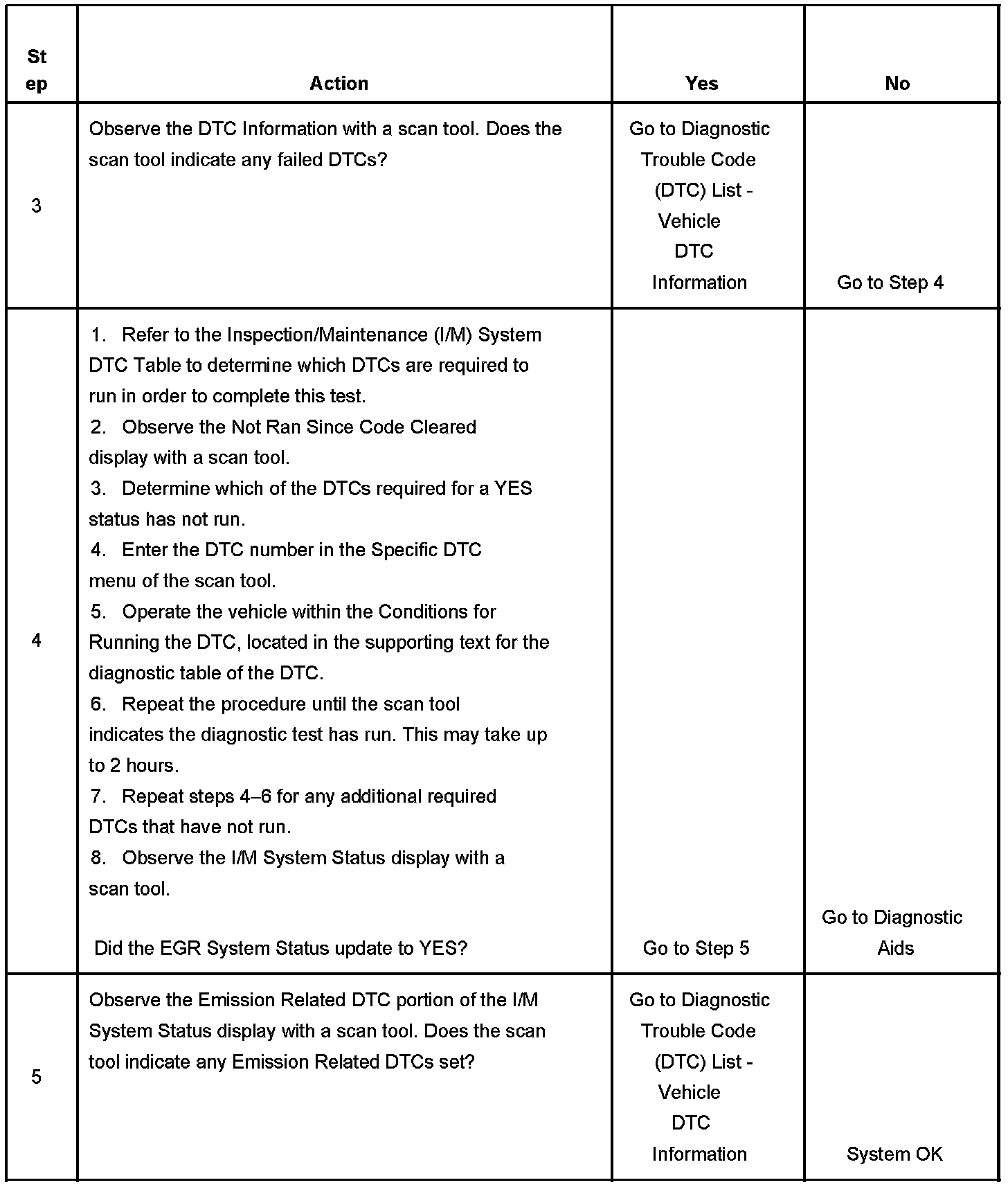 The control module only runs the EGR Active Tests during a gradual deceleration with a closed throttle and a vehicle speed above 48 km/h (30 mph). Several deceleration cycles may be necessary in order to accumulate a sufficient number of EGR flow samples. The procedure outlined in the table is for a clear, flat road. If the procedure is performed on a road with a slight down hill grade, the test may acquire the necessary sample counters in one or two decel trips. If the test is interrupted during the procedure, it may take more than three deceleration cycles to complete the test. If the status does not update, the test outlined in this procedure can be repeated until the I/M System Status updates to YES. If there is an impending failure, the system may require more time to run the diagnostic than was allotted in the set procedure. If the test does not run after numerous attempts and no DTC is set, review the appropriate scan tool data list and the service information for an indication of why the test does not complete. Some tests may abort due to changes in the conditions while the test is running. For example, changes in engine load such as a cooling fan or A/C compressor clutch turning ON may cause the test to abort. If a diagnostic test is difficult to run, observe the I/M System Status display while maintaining the necessary enable conditions until the System Status updates to YES.