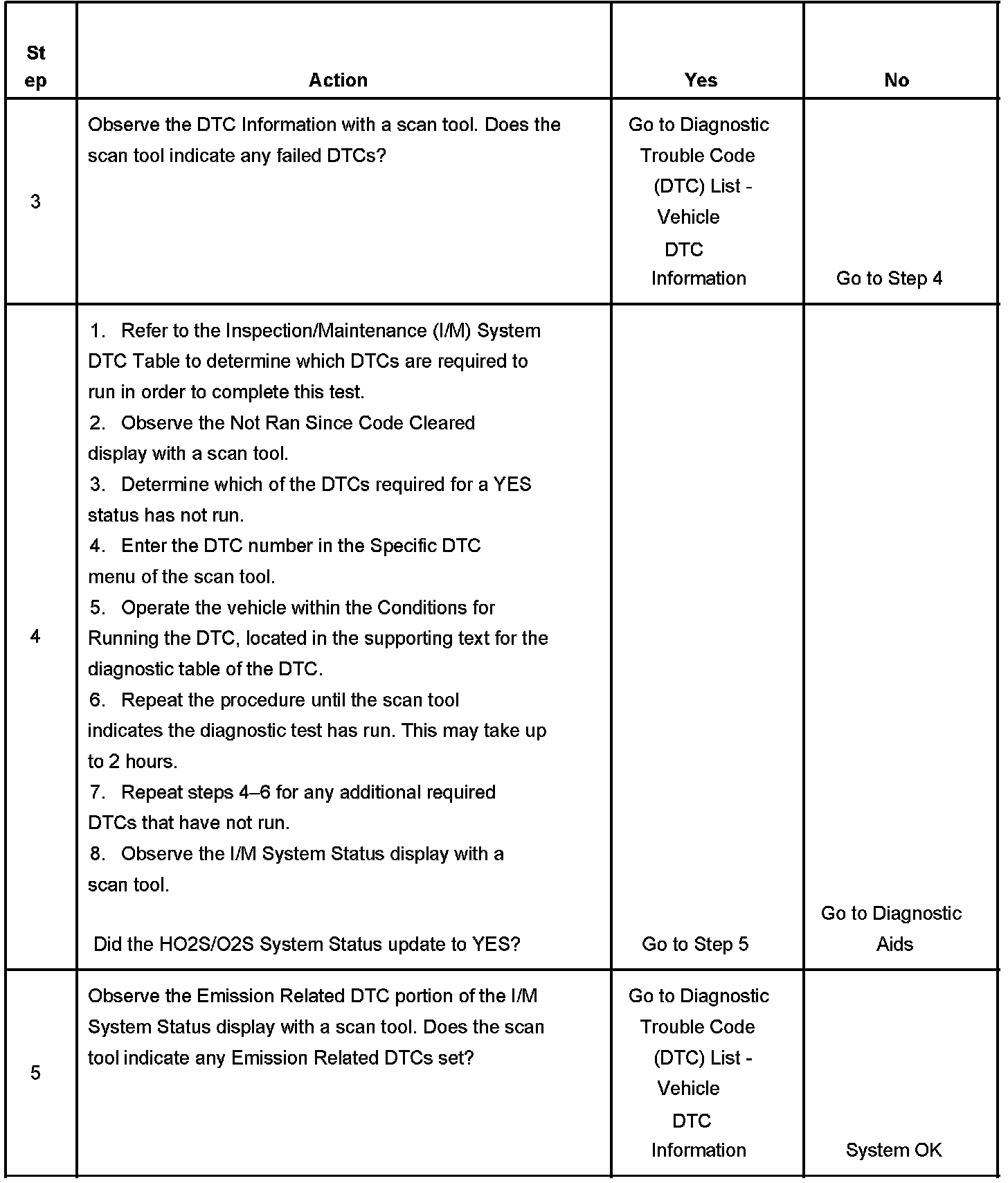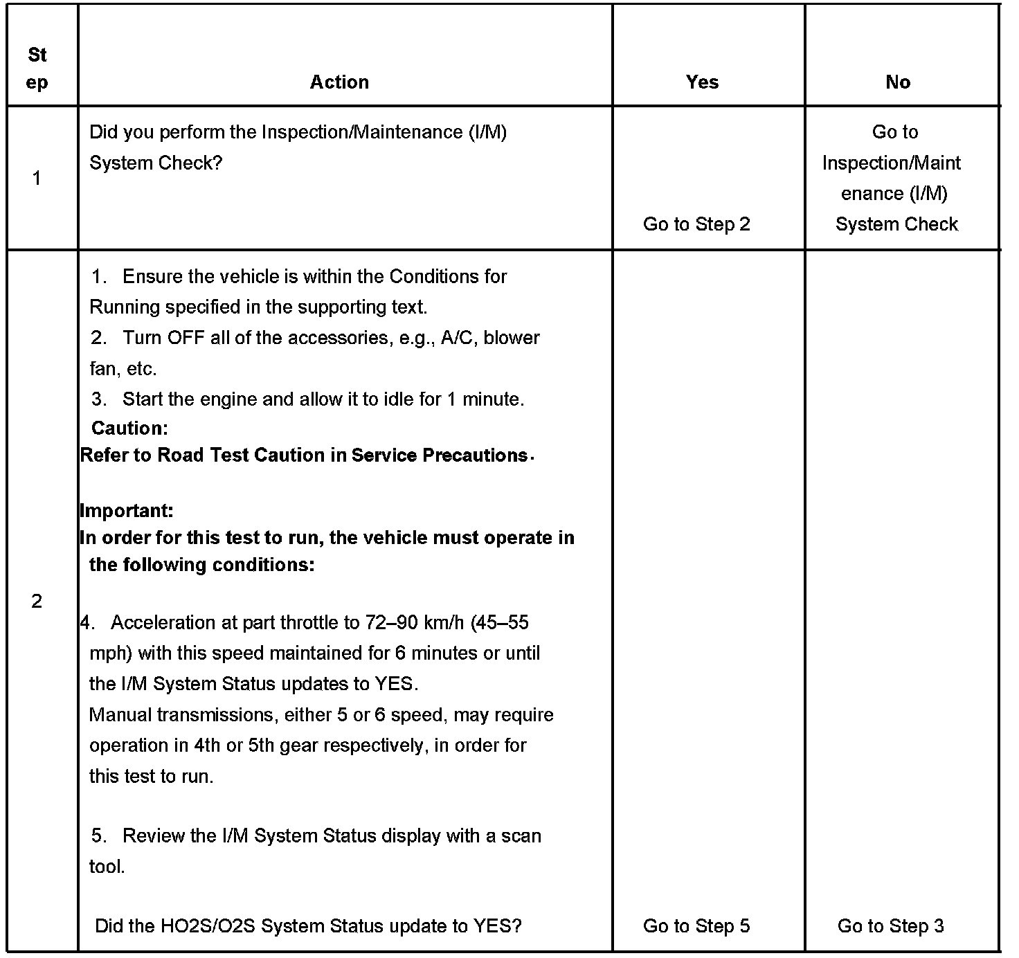 The purpose of this test is to satisfy the enable criteria necessary to execute I/M readiness diagnostics for the heated oxygen sensor/ oxygen sensor (HO2S/O2S) system. The test may be used to set the I/M System Status to YES. The I/M System Status display on the scan tool provides an indication of whether the control module has completed the required test. The required test is complete when either all of the DTCs comprising the test have run and passed, or when any one of the DTCs comprising the test has illuminated the malfunction indicator lamp (MIL). Once the test is complete, the I/M System Status display will indicate YES in the Completed column.