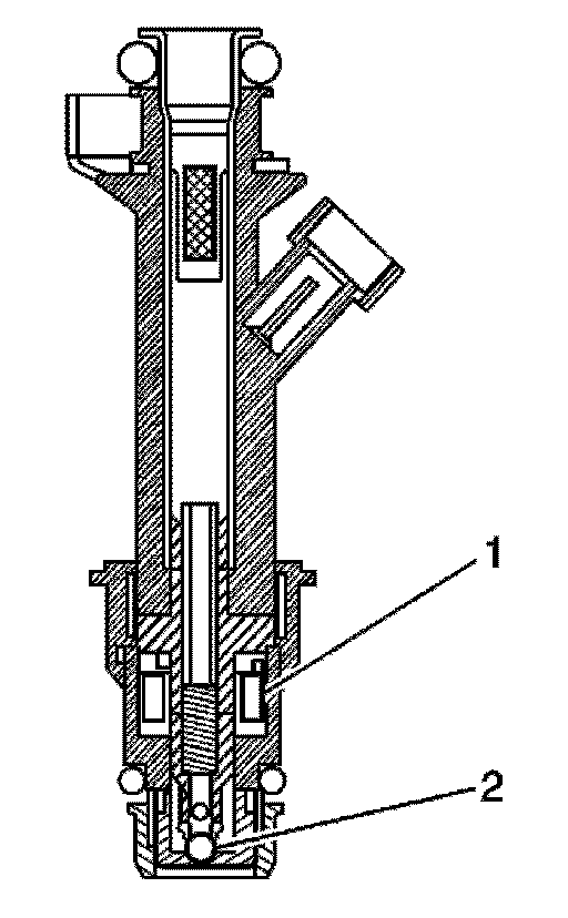The Multec 2 fuel injector assembly is a solenoid operated device, controlled by the powertrain control module (PCM), that meters pressurized fuel to a single engine cylinder. The PCM energizes the high-impedance (12.0 ohms) injector solenoid (1) to open a normally closed ball valve (2). This allows fuel to flow into the top of the injector, past the ball valve, and through a director plate at the injector outlet. The director plate has four machined holes that control the fuel flow, generating a spray of finely atomized fuel at the injector tip. Fuel from the injector tip is directed at the intake valve, causing it to become further atomized and vaporized before entering the combustion chamber. An injector stuck partly open can cause a loss of pressure after engine shutdown. Consequently, long cranking times would be noticed on some engines.