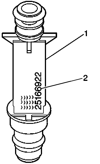 1. The fuel injector assembly (1) is stamped with a part number identification (2).