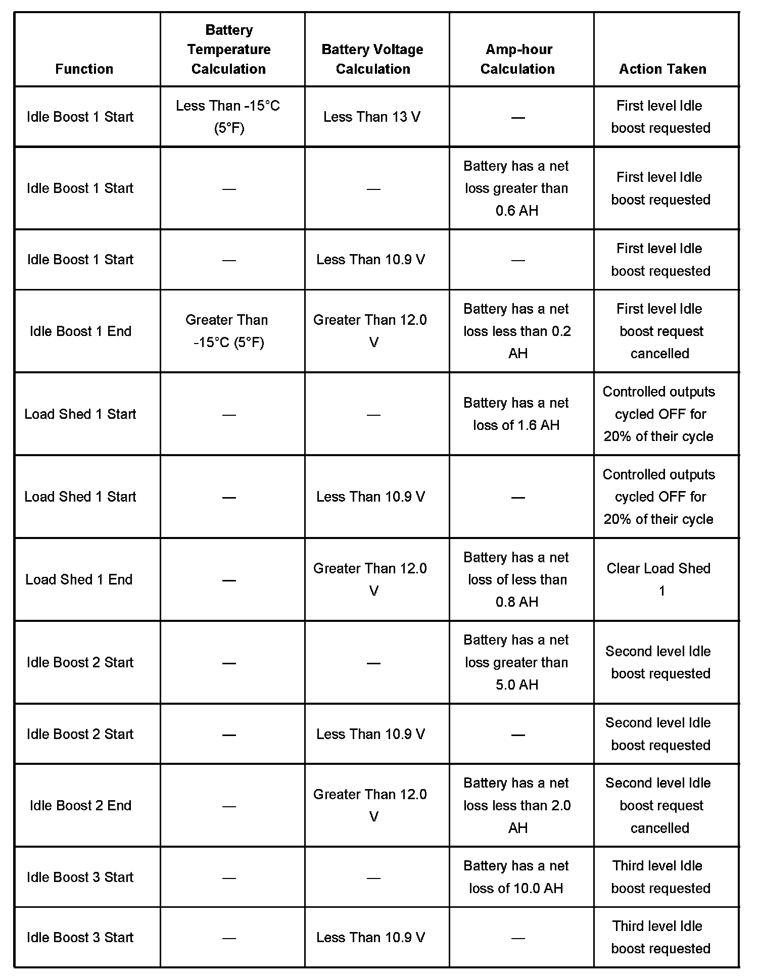 When the EPM algorithm is running, the DIM calculates the net charge rate on the electrical system by making constant voltage measurements. It uses the measurements to calculate the charge rate in amp/hours. If the DIM detects a negative charge rate, equal to a discharge from the battery, EPM can request up to 3 levels of idle boost from the ECM, when the vehicle is in park or neutral, as well as up to 2 levels of load shedding for a total of 5 levels of corrective action to maintain proper vehicle electrical system operation.