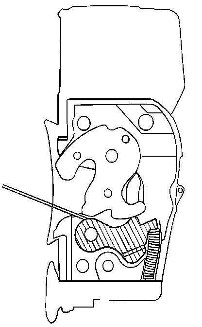 2. Allow the latch to completely thaw out and spray GM Super Lube(R) on BOTH sides of the latch detent lever for approximately two to three seconds. Refer to the above illustration (slashed area) for the lube location. Apply lube to all door latches. Operate the door latch several times to spread the lubricant on all surfaces.